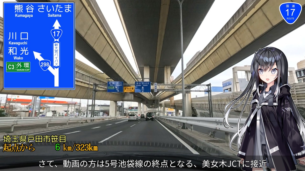 国道を走破しながらミリアルさんが地理や交通を解説してくれるシリーズ<br><br>27本目。東京都練馬区(現道は日本橋)と新潟県新潟市を結ぶ国道17号(全長323km)を走ります。Part1は新大宮バイパス入口から埼玉県鴻巣市の箕田交差点までの41km<br><br>新大宮バイパスは国道254号・川越街道との交差点から始まり、首都高速5号池袋線に沿って北へ伸びていきます。起点から約4kmで荒川を渡ると埼玉県戸田市へ。美女木JCTから先は埼玉大宮線の高架下を走ります。<br><br>埼玉大宮線の終点、与野出入口を過ぎると高架道路が途切れます。ここから先は首都高の延伸が事業化されている区間です。さらに、宮前ICで上尾道路と新大宮バイパスが分岐。新大宮バイパスの方は吉野町ICまで国道16号と重複します。<br><br>吉野町ICから先は大宮バイパスと呼ばれる片側2車線道路ですが、交通量がかなり多く混雑しがちです。上尾道路が鴻巣市の箕田交差点まで繋がるのはいつになることやら。<br><br>次→しばらくお待ちください<br>YouTube版→<a href="https://youtu.be/5YxywLMrW5U" target="_blank" rel="noopener nofollow">https://youtu.be/5YxywLMrW5U</a><br><br><br>■お借りした画像や音楽など<br>・CoeFont - Voiced by <a href="https://CoeFont.CLOUD" target="_blank" rel="noopener nofollow">https://CoeFont.CLOUD</a><br>・立ち絵:紀常式_ミリアル立ち絵 - <a href="https://seiga.nicovideo.jp/seiga/im10845488" target="_blank" rel="noopener nofollow">https://seiga.nicovideo.jp/seiga/im10845488</a><br>・放射第35号線だより - <a href="https://www.kensetsu.metro.tokyo.lg.jp/documents/d/kensetsu/000026831" target="_blank" rel="noopener nofollow">https://www.kensetsu.metro.tokyo.lg.jp/documents/d/kensetsu/000026831</a><br>・Car Watch 首都高、埼玉与野JCTに与野利便増進施設をオープン - <a href="https://car.watch.impress.co.jp/docs/news/395341.html" target="_blank" rel="noopener nofollow">https://car.watch.impress.co.jp/docs/news/395341.html</a><br>・埼玉県公式HP 海なし県に海を(水上公園の建設) - <a href="https://www.pref.saitama.lg.jp/a1105/910-20091204-114.html" target="_blank" rel="noopener nofollow">https://www.pref.saitama.lg.jp/a1105/910-20091204-114.html</a><br>・国土交通省 荒川上流河川事務所 - <a href="https://www.ktr.mlit.go.jp/arajo/arajo00040.html" target="_blank" rel="noopener nofollow">https://www.ktr.mlit.go.jp/arajo/arajo00040.html</a><br>♪Wind Trip - Fukagawa 様<br>♪Until We Smile Again - 松浦洋介 様<br>♪情報屋 - Heitaro Ashibe 様<br>♪旅の日記 - のる 様