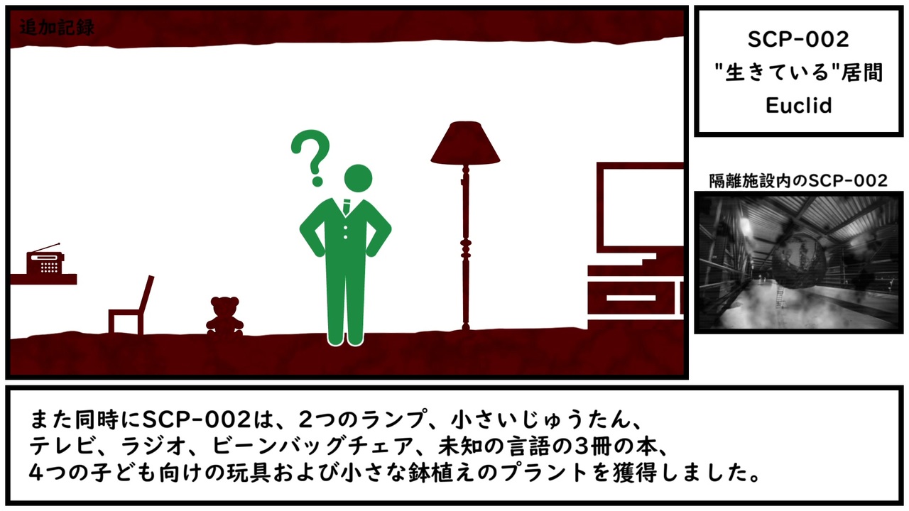 現在まで、SCP-002が原因で7名の職員が行方不明になっています。 <br><br>原語版タイトル: SCP-002 - The "Living" Room<br>訳者: 訳者不明<br>原語版作者: Unknown Author<br>ソース: <a href="http://scp-jp.wikidot.com/scp-002" target="_blank" rel="noopener nofollow">http://scp-jp.wikidot.com/scp-002</a><br>原語版ソース: <a href="http://scp-wiki.wikidot.com/scp-002" target="_blank" rel="noopener nofollow">http://scp-wiki.wikidot.com/scp-002</a><br>ライセンス: CC BY-SA 3.0<br>作成年: 2013<br>原語版作成年: 2008 <br><br>この作品は株式会社アクエストのライセンス(ID:AQALCNTUSR02072507)に基づいて生成された音声データを含んでいます。