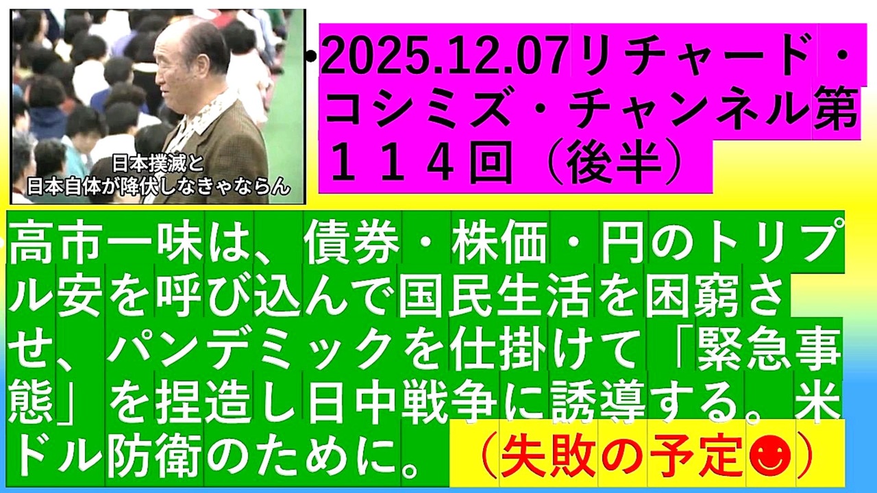 <span style="color: #cc0000;"><strong>◐『「 リチャード・コシミズ・チャンネル 」⦅ 第114回放送 ⦆②⦅ 改良版 ⦆』</strong></span><br><br> <span style="color: #ff0000;"><strong>「『 高市一味 』は、『 債券 』・『 株価 』・『 円 』の『 トリプル安 』を呼び込んで『 国民生活 』を『 困窮 』させ、『 パンデミック 』を<br> 仕掛けて『 緊急事態 』を『 捏造 』し、『 日中戦争 』に『 誘導 』する。『 米ドル防衛 』のために。⦅ 失敗の予定☻ ⦆」</strong></span><br><br> <span style="color: #38761d;"><strong>◐『 リチャード・コシミズ・チャンネル</strong></span><span style="color: #ff0000;"><strong>⦅ ニコニコ チャンネル ⦆</strong></span><span style="color: #38761d;"><strong>』</strong></span><br> <span style="color: #0000ff;"><strong><a href="https://ch.nicovideo.jp/richardkoshimizu" target="_blank" rel="noopener nofollow">https://ch.nicovideo.jp/richardkoshimizu</a></strong></span><br><br> <span style="color: #38761d;"><strong>◐『「 リチャード・コシミズ 講演会 」</strong></span><span style="color: #ff0000;"><strong>公式「 動画ギャラリー 」⦅ 最新動画 ⦆⦅ YouTube版 ⦆</strong></span><span style="color: #38761d;"><strong>』</strong></span><br> <span style="color: #0000ff;"><strong> <a href="https://www.youtube.com/@richardkoshimizu-video-gallery" target="_blank" rel="noopener nofollow">https://www.youtube.com/@richardkoshimizu-video-gallery</a></strong></span><br>