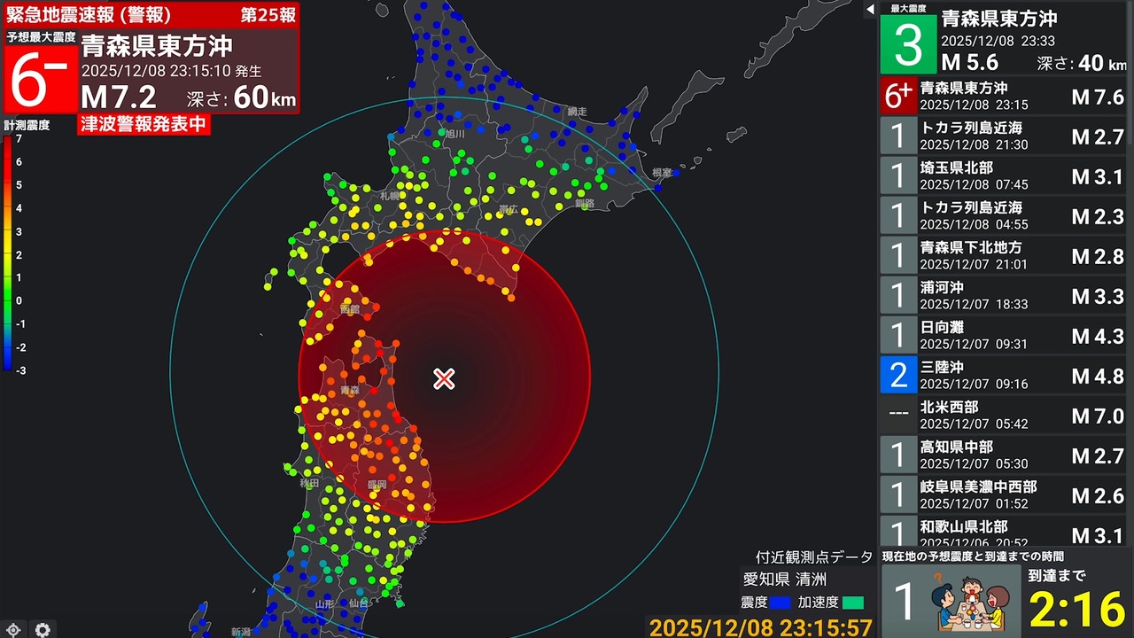 12月8日23時15分・23時33分頃の強震モニタ映像(簡単な解説字幕付き)です。<br>23時15分に発生した地震では<span style="color: #980000;"><strong>青森県八戸市で震度6強</strong></span>、<span style="color: #cc0000;">青森県おいらせ町と階上町で震度6弱</span>の激しい揺れを観測しました。<br>この地震により緊急地震速報および津波警報が発表され、現地では怪我人も発生しました。<br>さらに「北海道・三陸沖後発地震注意情報」が発表されたため、今後の地震活動に注意が必要です。<br><br><span style="font-size: 16px;"><strong>発生地震一覧 (カッコ内は動画時間)</strong></span><br>23時15分 青森県東方沖 M7.5 震度6強 (0:00)<br>23時33分 青森県東方沖 M5.6 震度3 (6:18)<br><br><span style="font-size: 16px;"><strong>本震の詳細情報</strong></span><br>発生日時:2025年12月8日 23時15分<br>震源地:青森県東方沖<br>震源の深さ:54km<br>マグニチュード:7.5 (Mw7.4)<br>発震メカニズム:プレート境界型地震<br>津波の有無:津波警報・津波注意報を発表し、岩手県で0.7mの津波が到達<br>備考:「北海道・三陸沖後発地震注意情報」を発表