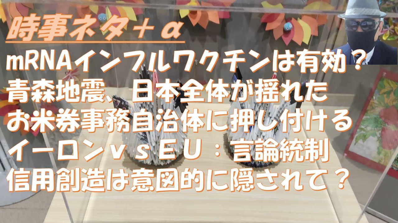 ◆鳥集徹<br>#120【mRNAインフルエンザワクチン】従来より34.5%優越? ~ファイザー「65歳以上データ排除疑惑」のNEJM論文を読む~<br><br>◆マスク信者<br>いつから「マスクする=感染しない」という神話が生まれたんだよ。マスク業者も困惑しとるぞ<br><br>「以前は副作用が怖かったけど…」 キャッチアップ接種の経過措置は来年3月末まで 東広島市役所では子宮頸がんワクチンの集団接種<br><br> 気象庁によると、8日午後11時15分ごろ、青森県三八上北で震度6強の地震があった。<br><br>「被害が思ったより少なくてよかった」で終わるんじゃなくて、「この規模がこの程度で済んでる日本、どれだけ綱渡りしてるんだよ」って、背筋を伸ばすところなんじゃないかしら?<br><br>再エネ賦課金がほぼ中国企業に流れていると榛葉幹事長が言ってしまう……<br><br>青切符導入を前に取り締まりが厳格化!? キーワードは「危険性帯有」 自転車の違反で"クルマの免停"が急増中!!<br><br>国民民主党 伊藤議員<br>『お米券には驚いた。準備は年度末の超繁忙期に丸投げ。<br><br>◆高市首相<br>本日は、アジェイ・バンガ世界銀行グループ総裁と、テドロス・アダノムWHO事務局長を、官邸にお迎えしました。<br><br>アメリカがWHOから脱退した後は<br>日本はWHOに際限なくカツアゲされる。<br><br>🚨【プーチン大統領が語る“本音”】<br><br><br>◆ねずみ<br>絶対に許しません!<br>ビル・トッテン<br><br>◆失敗小僧<br>中国海軍が自衛隊機にレーダー照射について<br><br>言論の自由を守るイーロン・マスクのXに欧州連合は巨額の罰金, イーロンは「EUはヒトラーの思想を借りた第四帝国」【及川幸久】<br><br>◆深田萌絵<br>中国「サンフランシスコ平和条約無効」論に、メディア「台湾は日本のモノ」理論推進のワナとは!?<br><br><br>2025.12.09リチャード・コシミズ・チャンネル第115回<br>中国は国産コロナワクチンとパンデミックで<br>数億の人口を失い、今も突然死が続いているのか。<br>生き残るのは国産ワクチンを打たなかった共産党員と未接種の1億人だけか?<br>中国では経済破綻と人口喪失が同時進行中<br><br>◆トランプ大統領<br>「グローバリストは必ず言論の自由を奪いにくる」<br><br>#鳥集徹<br>#中川淳一郎<br>#深田萌絵<br>#リチャード・コシミズ<br>#地震<br>#レーダー照射<br>#mRNA<br>#インフルエンザ<br>#ワクチン