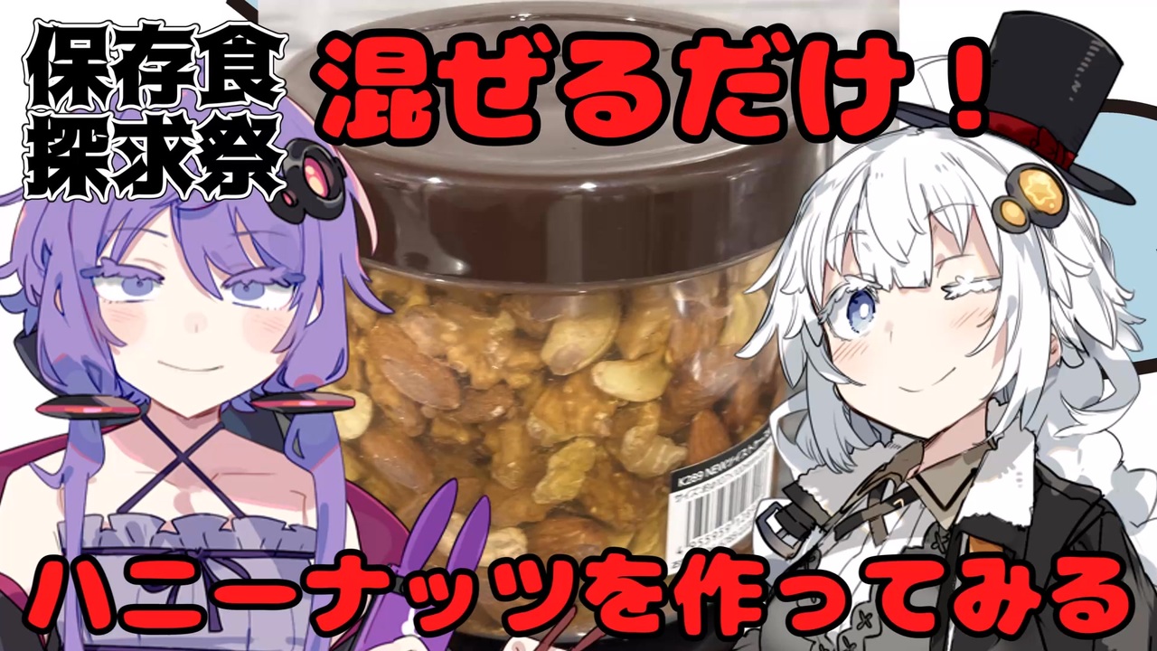 保存食探求祭用の動画です。<br>投稿者がたまに作るハニーナッツを今回は動画にしてみました。<br>床に落ちたナッツはスタッフが後で美味しくいただいています。<br><br>●参加動画イベント(ニコニコ動画)<br>・保存食探求祭<br>2025年12月12日(金)0:00~14日(日)23:59<br>秋と言えば実りの季節、収穫の秋です<br><a href="https://www.nicovideo.jp/watch/sm45411441" target="_blank" rel="noopener nofollow">https://www.nicovideo.jp/watch/sm45411441</a><br><br>※利用させて頂いた素材<br>■ボイス<br>紲星あかり(A.I.VOICE2)<br>結月ゆかり(A.I.VOICE2)<br><br>■立ち絵<br>紲星あかり:かれい(<a href="https://seiga.nicovideo.jp/seiga/im9233706" target="_blank" rel="noopener">im9233706</a>)<br>結月ゆかり:かれい(<a href="https://seiga.nicovideo.jp/seiga/im11404052" target="_blank" rel="noopener">im11404052</a>)<br><br>■素材(ニコニココモンズ)<br><a href="https://www.nicovideo.jp/watch/sm45411441" class="watch">sm45411441</a>,<a href="https://seiga.nicovideo.jp/seiga/im11672989" target="_blank" rel="noopener">im11672989</a>,<a href="https://seiga.nicovideo.jp/seiga/im9233706" target="_blank" rel="noopener">im9233706</a>,<a href="https://seiga.nicovideo.jp/seiga/im11404052" target="_blank" rel="noopener">im11404052</a>,<a href="https://commons.nicovideo.jp/works/nc258754" target="_blank" rel="noopener">nc258754</a>,<a href="https://www.nicovideo.jp/watch/sm39661703" class="watch">sm39661703</a>,<br><a href="https://commons.nicovideo.jp/works/nc181946" target="_blank" rel="noopener">nc181946</a>,<a href="https://commons.nicovideo.jp/works/nc164984" target="_blank" rel="noopener">nc164984</a>,<a href="https://commons.nicovideo.jp/works/nc255276" target="_blank" rel="noopener">nc255276</a>,<a href="https://commons.nicovideo.jp/works/nc38818" target="_blank" rel="noopener">nc38818</a>,<a href="https://commons.nicovideo.jp/works/nc236011" target="_blank" rel="noopener">nc236011</a>