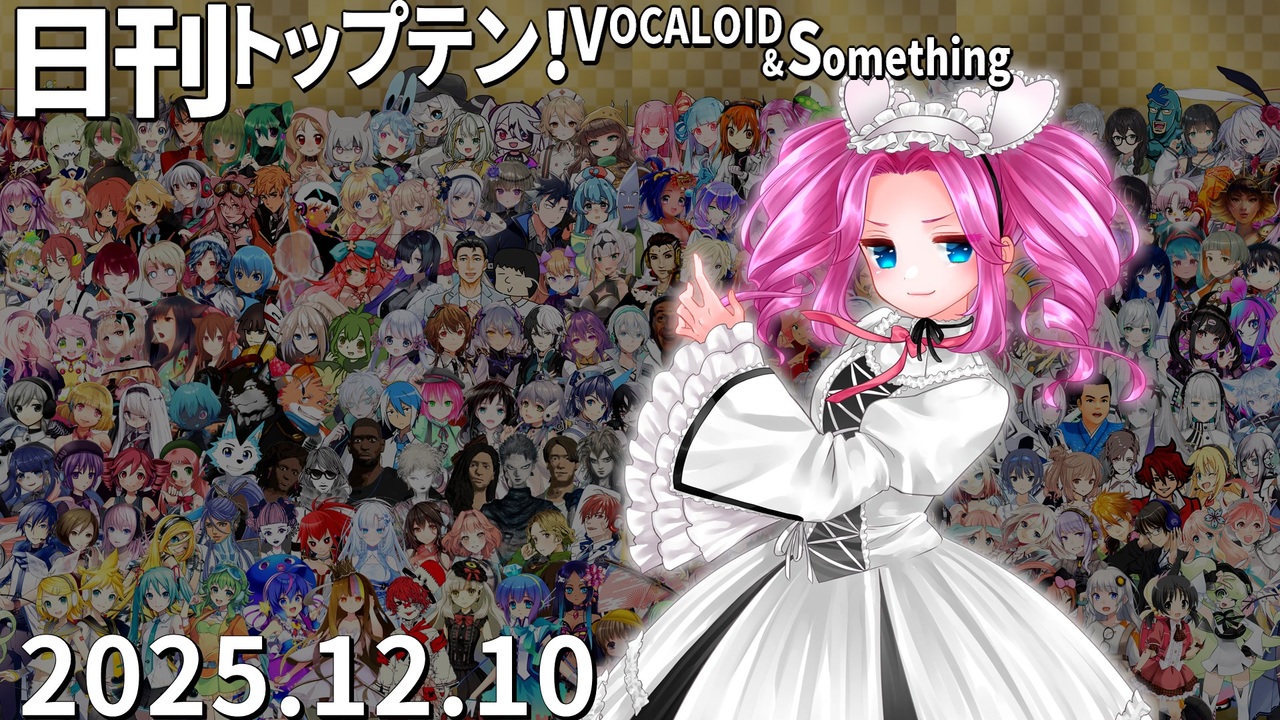 前日(12/9)←<a href="https://www.nicovideo.jp/watch/sm45712280" class="watch">sm45712280</a> <a href="https://www.nicovideo.jp/watch/sm45729102" class="watch">sm45729102</a>→翌日(12/11)<br>★クリエイター向けの生・動画企画「Pの一選」 <a href="https://nikeya.hateblo.jp/entry/20251125/1764078701" target="_blank" rel="noopener nofollow">https://nikeya.hateblo.jp/entry/20251125/1764078701</a><br>ボカロ系生主向けの生・動画企画「主の一選」 <a href="https://nikeya.hateblo.jp/entry/20251125/1764078713" target="_blank" rel="noopener nofollow">https://nikeya.hateblo.jp/entry/20251125/1764078713</a><br><br>★チャプター<br>昨日1位<a href="#" class="seekTime" data-seekTime="0:00" onclick="seekNicoPlayer('#0:00'); return false;">#0:00</a> TOP10<a href="#" class="seekTime" data-seekTime="0:36" onclick="seekNicoPlayer('#0:36'); return false;">#0:36</a> 1年前<a href="#" class="seekTime" data-seekTime="2:56" onclick="seekNicoPlayer('#2:56'); return false;">#2:56</a> TOP3<a href="#" class="seekTime" data-seekTime="3:24" onclick="seekNicoPlayer('#3:24'); return false;">#3:24</a> 10年前<a href="#" class="seekTime" data-seekTime="4:58" onclick="seekNicoPlayer('#4:58'); return false;">#4:58</a> PICKUP<a href="#" class="seekTime" data-seekTime="5:26" onclick="seekNicoPlayer('#5:26'); return false;">#5:26</a> <br><br>★トップテン<br>10:<a href="https://www.nicovideo.jp/watch/sm45692182" class="watch">sm45692182</a> 9:<a href="https://www.nicovideo.jp/watch/sm45693471" class="watch">sm45693471</a> 8:<a href="https://www.nicovideo.jp/watch/sm45698028" class="watch">sm45698028</a> 7:<a href="https://www.nicovideo.jp/watch/sm45692533" class="watch">sm45692533</a> <br>6:<a href="https://www.nicovideo.jp/watch/sm45698952" class="watch">sm45698952</a> 5:<a href="https://www.nicovideo.jp/watch/sm45664933" class="watch">sm45664933</a> 4:<a href="https://www.nicovideo.jp/watch/sm45706651" class="watch">sm45706651</a> 3:<a href="https://www.nicovideo.jp/watch/sm45702108" class="watch">sm45702108</a> 2:<a href="https://www.nicovideo.jp/watch/sm45700874" class="watch">sm45700874</a> 1:<a href="https://www.nicovideo.jp/watch/sm45711630" class="watch">sm45711630</a> <br><br>★ピックアップ(B~Dは超新着枠)<br>B:<a href="https://www.nicovideo.jp/watch/sm45711358" class="watch">sm45711358</a> C:<a href="https://www.nicovideo.jp/watch/sm45709598" class="watch">sm45709598</a> D:<a href="https://www.nicovideo.jp/watch/sm45711060" class="watch">sm45711060</a> E:<a href="https://www.nicovideo.jp/watch/sm45699952" class="watch">sm45699952</a> F:<a href="https://www.nicovideo.jp/watch/sm45659841" class="watch">sm45659841</a> G:<a href="https://www.nicovideo.jp/watch/sm45595730" class="watch">sm45595730</a> <br>H:<a href="https://www.nicovideo.jp/watch/sm45696606" class="watch">sm45696606</a> I:<a href="https://www.nicovideo.jp/watch/sm45698924" class="watch">sm45698924</a> J:<a href="https://www.nicovideo.jp/watch/sm45696890" class="watch">sm45696890</a> K:<a href="https://www.nicovideo.jp/watch/sm45692506" class="watch">sm45692506</a> L:<a href="https://www.nicovideo.jp/watch/sm45704943" class="watch">sm45704943</a> M:<a href="https://www.nicovideo.jp/watch/sm45696914" class="watch">sm45696914</a> <br>N:<a href="https://www.nicovideo.jp/watch/sm45698730" class="watch">sm45698730</a> O:<a href="https://www.nicovideo.jp/watch/sm45689291" class="watch">sm45689291</a> <br><br>★プレイバック <br>A(1年前):<a href="https://www.nicovideo.jp/watch/sm44410367" class="watch">sm44410367</a> 十(10年前):<a href="https://www.nicovideo.jp/watch/sm27764146" class="watch">sm27764146</a> 前日の第1位: <a href="https://www.nicovideo.jp/watch/sm45704785" class="watch">sm45704785</a>(四国めたん)<br><br>☆集計対象:2025/12/3~10 5時投稿の作品(12/10 5時集計)<br>★計算式:再生×1+コメント×最大12+いいね!×14+マイリスト×10<br>☆プレイリスト:<u><a href="https://nikkantop10.hatenablog.com/entry/ar20251210" target="_blank" rel="noopener nofollow">https://nikkantop10.hatenablog.com/entry/ar20251210</a></u> 、 <a href="https://www.nicovideo.jp/mylist/49271984" target="_blank" rel="noopener">mylist/49271984</a> <br>★1年前トップテン:<a href="https://www.nicovideo.jp/watch/sm44416360" class="watch">sm44416360</a><br />★日刊トップテン動画一覧マイリスト:<a href="https://www.nicovideo.jp/mylist/47849908" target="_blank" rel="noopener">mylist/47849908</a><br>☆ルールや計算式の詳細:<a href="https://nikkantop10-sub.hatenablog.com/entry/top10_rule" target="_blank" rel="noopener nofollow">https://nikkantop10-sub.hatenablog.com/entry/top10_rule</a><br><span style="color: #262626;">★K!!te Playlist LINK!:<a href="https://kiite.jp/user/AIST_playlist_bot" target="_blank" rel="noopener nofollow">https://kiite.jp/user/AIST_playlist_bot</a><br>☆Twitter:<a href="https://twitter.com/VOCALO_NEWRANK" target="_blank" rel="noopener nofollow">https://twitter.com/VOCALO_NEWRANK</a><br>★Thread:<a href="https://www.threads.net/@lukanan_p" target="_blank" rel="noopener nofollow">https://www.threads.net/@lukanan_p</a></span><br><br><span style="color: #0000ff;"><strong>◆今後の動画投稿イベント情報</strong></span><br>2025/12/29~31 <strong>先端映像音楽表現投稿祭</strong> <a href="https://twipla.jp/events/678401" target="_blank" rel="noopener nofollow">https://twipla.jp/events/678401</a><br>2026/1/1~4 <strong>ボカロサビ投稿祭2026 </strong><a href="https://twipla.jp/events/705936" target="_blank" rel="noopener nofollow">https://twipla.jp/events/705936</a> ※既存曲は新規投稿で参加可<br>2026/1/10~12 <strong>ポストロック投稿祭 </strong><a href="https://twipla.jp/events/694939" target="_blank" rel="noopener nofollow">https://twipla.jp/events/694939</a>
