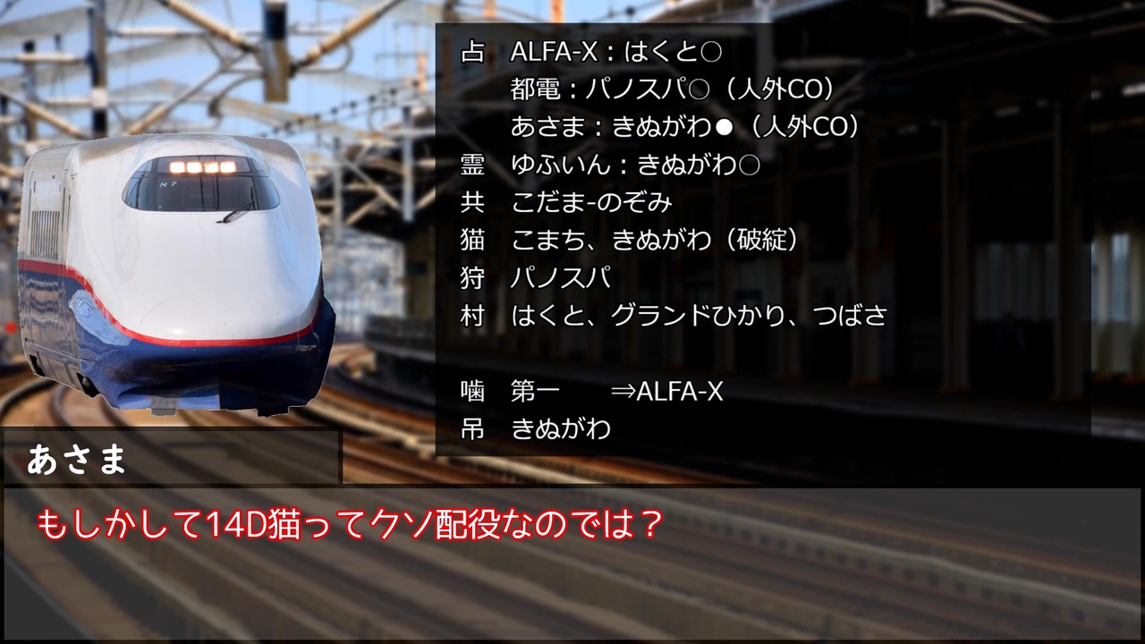 今回はちょっとしたNGシーン集があります。<br><br>14D猫:村2/占1/霊1/狩1/猫1/共2/狼3/信1/狐1/背1<br><br>2日目:<a href="https://www.nicovideo.jp/watch/sm45441550" class="watch">sm45441550</a><br>6日目:<a href="https://www.nicovideo.jp/watch/sm45678584" class="watch">sm45678584</a> 次村:12/14 <a href="https://www.nicovideo.jp/watch/sm45718872" class="watch">sm45718872</a><br><br>裏話ブログ記事<br><a href="https://sagodaberi.livedoor.blog/archives/46331323.html" target="_blank" rel="noopener nofollow">https://sagodaberi.livedoor.blog/archives/46331323.html</a><br><br>Twitterで考察して頂ける方は『#電車で人狼』を入れて呟いていただけると探しやすいです。<br>擬人化関連のFAは『#鉄擬で人狼』を入れて頂けると助かります。<br>(既に投稿されたものはそのままで大丈夫ですよ!)<br><br>電車で人狼!マイリスト <a href="https://www.nicovideo.jp/mylist/72946958" target="_blank" rel="noopener">mylist/72946958</a><br>電車で人狼! 支線編(解説動画) <a href="https://www.nicovideo.jp/mylist/79077747" target="_blank" rel="noopener">mylist/79077747</a><br>人狼動物園マイリスト <a href="https://www.nicovideo.jp/mylist/72986089" target="_blank" rel="noopener">mylist/72986089</a><br><br><a target="_blank" href="https://qa.nicovideo.jp/faq/show/19424?site_domain=default" style="font-size: 13px;color: #657586; text-decoration: underline; line-height: 1.4">この動画は投稿者によって修正されました</a>