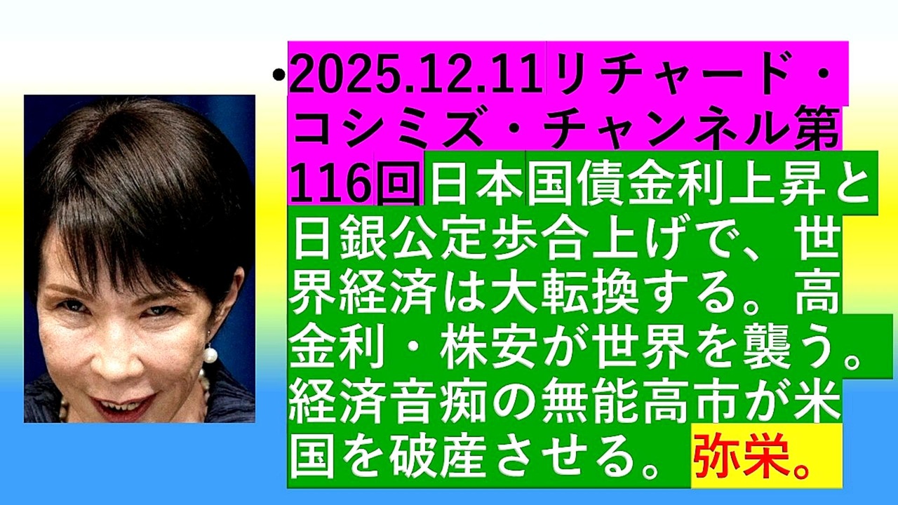 <span style="color: #cc0000;"><strong>◐『「 リチャード・コシミズ・チャンネル 」⦅ 第116回放送 ⦆⦅ 改良版 ⦆』</strong></span><br><br> <span style="color: #ff0000;"><strong>「『 日本国債金利上昇 』と『 日銀公定歩合上げ 』で、『 世界経済 』は『 大転換 』する。『 高金利 』・『 株安 』が<br> 『 世界 』を襲う。『 経済音痴 』の『 無能 高市早苗 』が『 米国 』を『 破産 』させる。『 弥栄 』」</strong></span><br><br> <span style="color: #38761d;"><strong>◐『 リチャード・コシミズ・チャンネル</strong></span><span style="color: #ff0000;"><strong>⦅ ニコニコ チャンネル ⦆</strong></span><span style="color: #38761d;"><strong>』</strong></span><br> <span style="color: #0000ff;"><strong><a href="https://ch.nicovideo.jp/richardkoshimizu" target="_blank" rel="noopener nofollow">https://ch.nicovideo.jp/richardkoshimizu</a></strong></span><br><br> <span style="color: #38761d;"><strong>◐『「 リチャード・コシミズ 講演会 」</strong></span><span style="color: #ff0000;"><strong>公式「 動画ギャラリー 」⦅ 最新動画 ⦆⦅ YouTube版 ⦆</strong></span><span style="color: #38761d;"><strong>』</strong></span><br> <span style="color: #0000ff;"><strong> <a href="https://www.youtube.com/@richardkoshimizu-video-gallery" target="_blank" rel="noopener nofollow">https://www.youtube.com/@richardkoshimizu-video-gallery</a></strong></span><br>