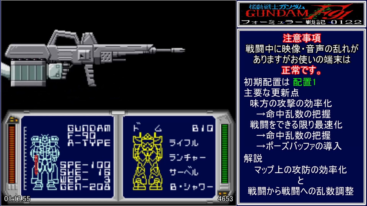 乱数調査の結果 RTAへ影響が出ました。<br>調査結果報告動画は今制作中です。<br>各武器のクリティカル率はスプレッドシートに記載済みです。<br><br>全計測区間:ゲーム起動~最後の入力まで<br> frames:9140 / re-recording:1483(ACT.1終了地点)<br>ACT.1計測区間:ゲーム起動~セーブ後暗転まで<br> frames:9140 / re-recording:1483<br><br>TAS ACT.1:ここ → ACT.2:ふりだしにもどる→<a href="https://www.nicovideo.jp/watch/sm45863068" class="watch">sm45863068</a><br>一覧:<a href="https://www.nicovideo.jp/series/532632" target="_blank" rel="noopener">series/532632</a><br>偉大な先駆者様:<a href="https://www.nicovideo.jp/watch/sm12433909" class="watch">sm12433909</a><br><br>RTA一覧:<a href="https://www.nicovideo.jp/series/492029" target="_blank" rel="noopener">series/492029</a><br><br>プレイ環境:Snes9x 1.60<br>編集環境:AviUtl<br /><br>↓投稿者お手製フォーミュラー戦記の攻略本(仮)最終更新日:2026/1/6<br><a href="https://docs.google.com/spreadsheets/d/1DQnb7GurKi1y6yCNLNoHER9v3d-p6vZwB3bxt_ykGj8" target="_blank" rel="noopener nofollow">https://docs.google.com/spreadsheets/d/1DQnb7GurKi1y6yCNLNoHER9v3d-p6vZwB3bxt_ykGj8</a><br><br>※いつも再生、コメント、いいね、広告、マイリスト、フォローありがとうございます。
