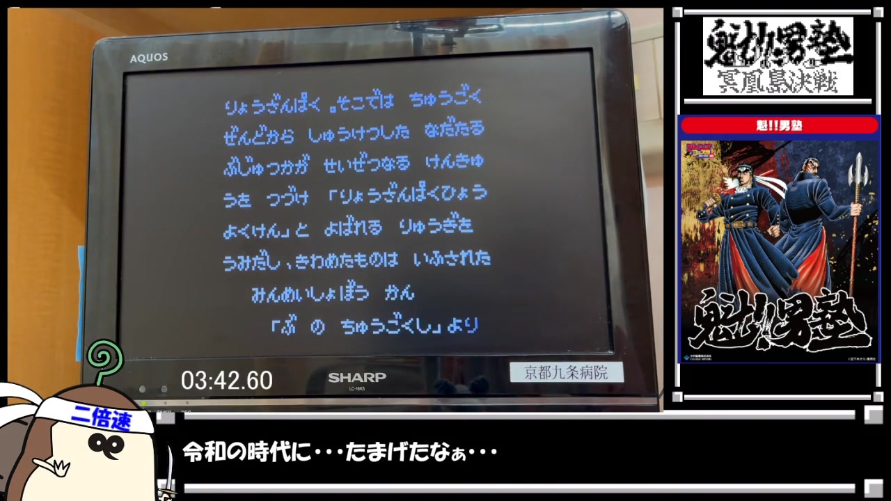 健康第一!!<br><br><レギュレーション説明><br>入院した上で病室のテレビにててんちょうごりんモードをプレイする<br><br><プレイ環境・タイムについて><br>場所:京都九条病院<br><br>病名:急性虫垂炎<br><br>レトロフリークにてプレイ<br><br>タイマーは録画した動画に編集で追加したものです<br><br>タイマースタート:『てんちょうごりんモード』を選択した瞬間<br>タイマーストップ:『完』の文字が出切った瞬間<br><br><動画作成でお世話になりました><br>魁!!男塾 作者:宮下あきら様<br> <a href="https://www.s-manga.net/items/contents.html?isbn=4-08-617521-5" target="_blank" rel="noopener nofollow">https://www.s-manga.net/items/contents.html?isbn=4-08-617521-5</a><br><br>ジャンプフェスタ2026<br> <a href="https://www.jumpfesta.com/" target="_blank" rel="noopener nofollow">https://www.jumpfesta.com/</a><br><br>中外鉱業株式会社 ジャンプフェスタ2026出店情報<br> <a href="https://www.chugai-contents.jp/blog/event/jf2026/" target="_blank" rel="noopener nofollow">https://www.chugai-contents.jp/blog/event/jf2026/</a><br><br>ジャンプLAB<br> <a href="https://jump-lab.jp/" target="_blank" rel="noopener nofollow">https://jump-lab.jp/</a><br><br>吉祥寺サンロード商店街<br> <a href="https://sun-road.or.jp/" target="_blank" rel="noopener nofollow">https://sun-road.or.jp/</a><br><br>TVアニメ『ハイスクール!奇面組』公式サイト<br> <a href="https://kimengumi.com/" target="_blank" rel="noopener nofollow">https://kimengumi.com/</a><br><br>ソーシャルゲーム 魁!!男塾~連合大闘争編~(㈱ビジュアライズ)<br> <a href="https://www.visualize.co.jp/business/game/" target="_blank" rel="noopener nofollow">https://www.visualize.co.jp/business/game/</a><br><br>VOICEVOX:WhiteCUL<br> <a href="https://voicevox.hiroshiba.jp/" target="_blank" rel="noopener nofollow">https://voicevox.hiroshiba.jp/</a><br> <a href="https://www.whitecul.com/" target="_blank" rel="noopener nofollow">https://www.whitecul.com/</a><br><br>左下 キュイ族 マチャーのイラスト:知り合いの絵師FJWRRY様<br> ※キュイ族:ゼルダの伝説 スカイウォードソードに登場する草食亜人<br><br><過去のRTA動画><br>【初】<a href="https://www.nicovideo.jp/watch/sm44038010" class="watch">sm44038010</a><br>【再走】<a href="https://www.nicovideo.jp/watch/sm44048854" class="watch">sm44048854</a><br>【再々走】<a href="https://www.nicovideo.jp/watch/sm44065747" class="watch">sm44065747</a><br>【再々々走】<a href="https://www.nicovideo.jp/watch/sm44090912" class="watch">sm44090912</a><br>【再々々々走】<a href="https://www.nicovideo.jp/watch/sm44135185" class="watch">sm44135185</a><br>【再々々々々走】<a href="https://www.nicovideo.jp/watch/sm44161616" class="watch">sm44161616</a><br>【再々々々々々走】<a href="https://www.nicovideo.jp/watch/sm44229688" class="watch">sm44229688</a><br>【再々々々々々々走】<a href="https://www.nicovideo.jp/watch/sm44352376" class="watch">sm44352376</a><br>【再々々々々々々々走】<a href="https://www.nicovideo.jp/watch/sm44494593" class="watch">sm44494593</a><br>【再々々々々々々々々走】<a href="https://www.nicovideo.jp/watch/sm44614961" class="watch">sm44614961</a><br>【再々々々々々々々々々走】<a href="https://www.nicovideo.jp/watch/sm44815259" class="watch">sm44815259</a><br>【再々々々々々々々々々々走】<a href="https://www.nicovideo.jp/watch/sm45040106" class="watch">sm45040106</a>