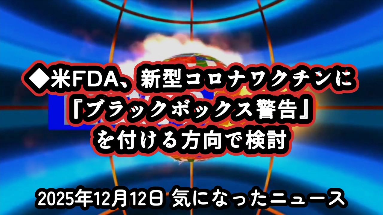 ◆FDA『ブラックボックス警告』検討へ ~ CNN報道が揺らすワクチン政策の転換点<br><br>FDA『最重大警告』検討へ<br><br>あらすじ<br>米国FDAが、新型コロナワクチンに『ブラックボックス警告』を付ける計画を検討している──そんな情報が複数の関係者から伝えられ、静かに注目を集めています。ブラックボックス警告とは、医薬品のリスクの中でも最も重い段階で、重大な副作用や使用制限を知らせる“最上位”の警告。この動きが本当に現実化するのか、対象範囲はどこまでなのか、そして政策や医療現場にどんな影響を及ぼすのか。本編では、まだ公式発表前の段階にあるこの計画の背景や意味を掘り下げます。<br><br>◆今回の台本&詳細<a href="https://keiichiro8140.hatenablog.com/entry/25121222333999" target="_blank" rel="noopener nofollow">https://keiichiro8140.hatenablog.com/entry/25121222333999</a><br><br>◆これまでの動画<a href="https://x.gd/sPXoJ" target="_blank" rel="noopener nofollow">https://x.gd/sPXoJ</a><br><br>◆もしも(BAN)の時のためのマイリンク集<a href="https://lit.link/K-16_News44" target="_blank" rel="noopener nofollow">https://lit.link/K-16_News44</a><br><br>ご覧いただきありがとうございます<br>m(_ _)m<br><br>気になったニュース 2025/12/12<br><br />著作権、肖像権に配慮して作成しております。<br><br>◆気になったニュースの台本!?<br>メモ代わりに作った台本をそのままあげてます<br><a href="https://keiichiro8140.hatenablog.com/." target="_blank" rel="noopener nofollow">https://keiichiro8140.hatenablog.com/.</a><br><br><br>ここからはシリーズ紹介<br><br><br>◆ ワクチン解毒・デトックス<br><a href="https://x.gd/fZweg" target="_blank" rel="noopener nofollow">https://x.gd/fZweg</a><br><br>◆ウイリアム・マキス博士のがん治療(イベルメクチン・フェンベンダゾール等)<br><a href="https://x.gd/AtFYS" target="_blank" rel="noopener nofollow">https://x.gd/AtFYS</a><br><br>◆予防接種健康被害救済制度<br><a href="https://x.gd/0xK9x" target="_blank" rel="noopener nofollow">https://x.gd/0xK9x</a><br><br>◆気になったニュース #1501~<br><br>◆ 【ショートver】気になったニュース<br><a href="https://x.gd/7MxXC" target="_blank" rel="noopener nofollow">https://x.gd/7MxXC</a><br><br>◆ 気になったニュース #1001~<br><a href="https://x.gd/Lp8gv" target="_blank" rel="noopener nofollow">https://x.gd/Lp8gv</a><br><br>◆ 気になったニュース #501~<br><a href="https://x.gd/EmbS4" target="_blank" rel="noopener nofollow">https://x.gd/EmbS4</a><br><br>◆ 気になったニュース #1~#500<br><a href="https://x.gd/uPhNb" target="_blank" rel="noopener nofollow">https://x.gd/uPhNb</a><br><br>◆ X(旧Twitter)・テレグラムで気になった情報<br><a href="https://x.gd/YG6FT" target="_blank" rel="noopener nofollow">https://x.gd/YG6FT</a><br><br>◆ 日比谷5万人パレードデ⚪生放送アーカイブ動画<br><a href="https://x.gd/3CHJv" target="_blank" rel="noopener nofollow">https://x.gd/3CHJv</a><br><br>◆日比谷5万人パレード⚪モのマイリスト作ってみました<br><a href="https://nico.ms/mylist/76828848?ref=sp_other" target="_blank" rel="noopener nofollow">https://nico.ms/mylist/76828848?ref=sp_other</a><br><br>◆3.30 令和の百姓⚪⚪<br><a href="https://www.nicovideo.jp/series/511791?ref=garage_share_other" target="_blank" rel="noopener nofollow">https://www.nicovideo.jp/series/511791?ref=garage_share_other</a><br><br>◆ 及川幸久さんの【XNEWS】シリーズ<br><a href="https://x.gd/3k78K" target="_blank" rel="noopener nofollow">https://x.gd/3k78K</a><br><br>◆これまでの動画<a href="https://x.gd/sPXoJ" target="_blank" rel="noopener nofollow">https://x.gd/sPXoJ</a><br><br>◆もしも(BAN)の時のためのマイリンク集<a href="https://lit.link/K-16_News44" target="_blank" rel="noopener nofollow">https://lit.link/K-16_News44</a><br><br>