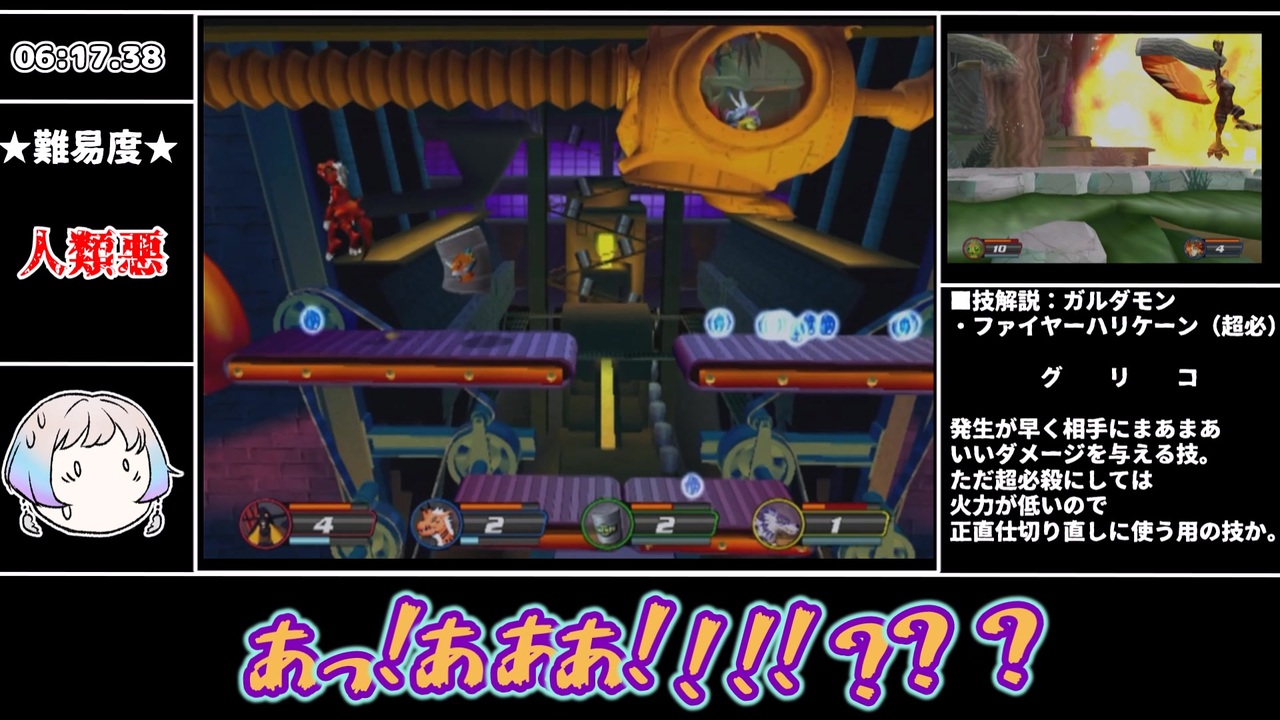 <span style="font-size: 24px;"><strong>投稿者はゲームが上手くありません。</strong></span><br>デジモンファンからのヘイトがすごいことで有名なゲーム、再走しました。<br>クソゲーだけどなんだかんだこのゲーム自分好きなんだなって。()<br><br><span style="color: #ff0000;"><strong>後付タイマーなので参考記録です。</strong></span><br><br>※ボイマキさんと混同されないよう、羽ノ華さんとしての調声を<br>自分なりに頑張ったつもりです。<br><strong>なのでマキさんにまつわるコメントについては空気を読んでお控えください。</strong><br><br>動画中でネタにした動画の宣伝。<br>【A.I.VOICE実況】大体敵を蹴散らすみのりーコング エリア4 前編+おまけ【SDK】<br><a href="https://www.nicovideo.jp/watch/sm45643752" target="_blank" rel="noopener nofollow">https://www.nicovideo.jp/watch/sm45643752</a><br><br>Q.「ルート変えて得意なとこに行くのは難しいんかね」<br>A.最難ルートレギュレーションなのでそれ以外のルートに行くのは禁止としております。<br><br>■使用ソフト・キャラ<br>●A.I.VOICE2<br>羽ノ華<br><br>■使用素材・ツール<br>YMM4lite<br>ニコニ・コモンズ