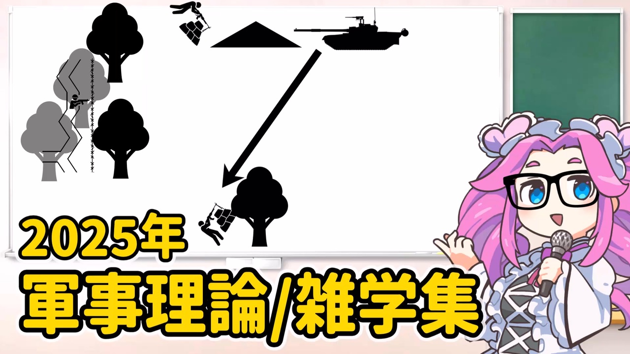 2025年に投稿した動画の軍事理論や雑学を取り上げた部分を切り抜きました。<br><br>VOICEVOX:ずんだもん、四国めたん、春日部つむぎ、満別花丸<br><br><a href="#" class="seekTime" data-seekTime="0:00" onclick="seekNicoPlayer('#0:00'); return false;">#0:00</a> ドローンの利点と着弾観測の効果<br><a href="#" class="seekTime" data-seekTime="0:38" onclick="seekNicoPlayer('#0:38'); return false;">#0:38</a> ドローン対策①電子妨害<br><a href="#" class="seekTime" data-seekTime="1:33" onclick="seekNicoPlayer('#1:33'); return false;">#1:33</a> ドローン対策②隠掩蔽<br><a href="#" class="seekTime" data-seekTime="3:26" onclick="seekNicoPlayer('#3:26'); return false;">#3:26</a> ドローン対策③欺騙<br><a href="#" class="seekTime" data-seekTime="6:59" onclick="seekNicoPlayer('#6:59'); return false;">#6:59</a> 戦車と比較した際のドローンの欠点<br><a href="#" class="seekTime" data-seekTime="9:19" onclick="seekNicoPlayer('#9:19'); return false;">#9:19</a> ドローンが支配する戦場での戦車の理想と現実<br><a href="#" class="seekTime" data-seekTime="9:58" onclick="seekNicoPlayer('#9:58'); return false;">#9:58</a> 市街戦と戦車<br><a href="#" class="seekTime" data-seekTime="10:50" onclick="seekNicoPlayer('#10:50'); return false;">#10:50</a> 大隊戦術群(BTG)<br><a href="#" class="seekTime" data-seekTime="17:53" onclick="seekNicoPlayer('#17:53'); return false;">#17:53</a> 防御戦闘と逆襲<br><a href="#" class="seekTime" data-seekTime="18:27" onclick="seekNicoPlayer('#18:27'); return false;">#18:27</a> 第1線と主陣地帯<br><a href="#" class="seekTime" data-seekTime="19:31" onclick="seekNicoPlayer('#19:31'); return false;">#19:31</a> 地雷の活用法の一例<br><a href="#" class="seekTime" data-seekTime="20:11" onclick="seekNicoPlayer('#20:11'); return false;">#20:11</a> 洪水線<br><a href="#" class="seekTime" data-seekTime="21:20" onclick="seekNicoPlayer('#21:20'); return false;">#21:20</a> 水域を挟む補給の難しさ<br><a href="#" class="seekTime" data-seekTime="21:34" onclick="seekNicoPlayer('#21:34'); return false;">#21:34</a> ゲリラ戦の性質<br><a href="#" class="seekTime" data-seekTime="23:05" onclick="seekNicoPlayer('#23:05'); return false;">#23:05</a> サーモバリック弾とは<br><a href="#" class="seekTime" data-seekTime="26:25" onclick="seekNicoPlayer('#26:25'); return false;">#26:25</a> 制空権・航空優勢とは<br><a href="#" class="seekTime" data-seekTime="30:24" onclick="seekNicoPlayer('#30:24'); return false;">#30:24</a> ウクライナ侵攻での地対空、空対空ミサイルの最長距離撃墜記録<br><a href="#" class="seekTime" data-seekTime="30:57" onclick="seekNicoPlayer('#30:57'); return false;">#30:57</a> 爆撃の分類(ロバート・ペイプ)<br><a href="#" class="seekTime" data-seekTime="31:50" onclick="seekNicoPlayer('#31:50'); return false;">#31:50</a> 奇襲効果の数量的表現<br><a href="#" class="seekTime" data-seekTime="32:48" onclick="seekNicoPlayer('#32:48'); return false;">#32:48</a> 指揮系統の麻痺とタイミングの重要性<br><a href="#" class="seekTime" data-seekTime="33:12" onclick="seekNicoPlayer('#33:12'); return false;">#33:12</a> 基地の立地と海空軍の特徴<br><a href="#" class="seekTime" data-seekTime="34:21" onclick="seekNicoPlayer('#34:21'); return false;">#34:21</a> ロシアの諜報機関とその手法の長短<br><a href="#" class="seekTime" data-seekTime="35:59" onclick="seekNicoPlayer('#35:59'); return false;">#35:59</a> 情勢分析の能力向上のための提言(CSIS)<br><a href="#" class="seekTime" data-seekTime="37:46" onclick="seekNicoPlayer('#37:46'); return false;">#37:46</a> ウクライナ侵攻の特徴と戦いからの教訓(RUSI)<br><a href="#" class="seekTime" data-seekTime="47:34" onclick="seekNicoPlayer('#47:34'); return false;">#47:34</a> 2023年宇軍反攻失敗からの教訓(RUSI)<br><a href="#" class="seekTime" data-seekTime="1:03" onclick="seekNicoPlayer('#1:03'); return false;">#1:03</a>:50 現代の先進国の軍隊は装備の減価償却をしなければならない
