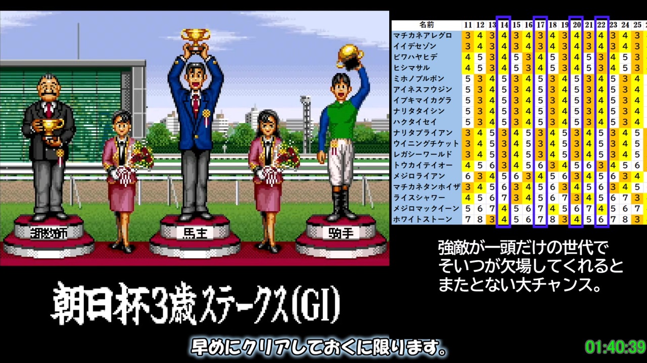 全GⅠ制覇してエンディングを見るまで。<br>次→<a href="https://www.nicovideo.jp/watch/sm45840366" class="watch">sm45840366</a><br>解説無し全編はこちら→ <a href="https://www.nicovideo.jp/watch/sm45472095" class="watch">sm45472095</a><br>参考攻略サイト <br>・湯一路ダビスタページ…<a href="https://derbystallion.info/ds96/" target="_blank" rel="noopener nofollow">https://derbystallion.info/ds96/</a> <br>・ダビスタ96 完全解析…<a href="https://ds96keisan.web.fc2.com/" target="_blank" rel="noopener nofollow">https://ds96keisan.web.fc2.com/</a> <br>・ダビスタ97攻略情報 (PS版ダービースタリオン)…<a href="https://psgamekouryaku.com/ds97/" target="_blank" rel="noopener nofollow">https://psgamekouryaku.com/ds97/</a> <br>・方位774…<a href="https://houi774.web.fc2.com/derbystallion/" target="_blank" rel="noopener nofollow">https://houi774.web.fc2.com/derbystallion/</a> <br>これらの情報が無ければRTAが成り立たないのはもちろん、今プレイし直すことも無かったと思います。大変お世話になりました。<br>©1996 Sonobe Hiroyuki / ASCII Corporation