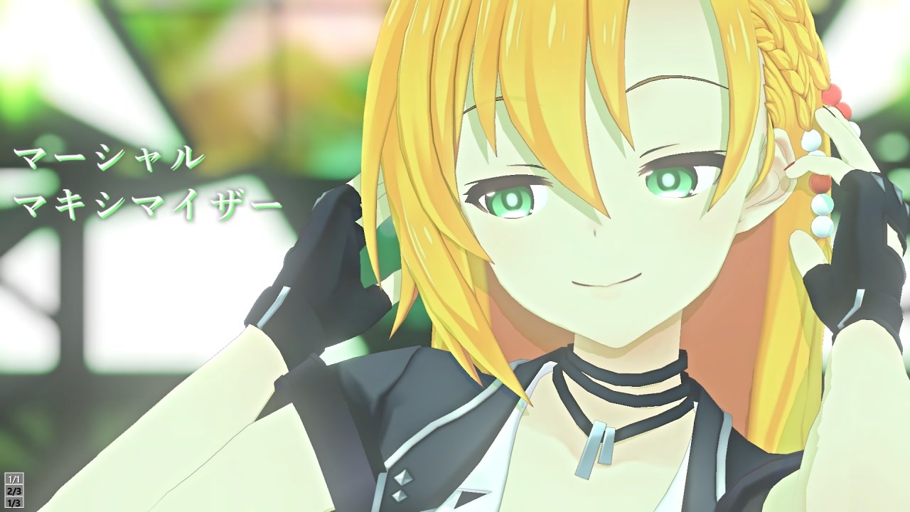 初めましての方は初めまして、Sabineです <br>今回は弦巻マキちゃんにマーシャル・マキシマイザーを歌って踊ってもらいました<br><br>MMD初心者なので拙いところもございますが、良ければ見ていってください<br>==お借りしたもの==<br>【Music】<br>楽曲:「マーシャル・マキシマイザー」/ 柊マグネタイト様<br>マーシャル・マキシマイザー / 柊マグネタイト feat.可不<br><a href="https://www.nicovideo.jp/watch/sm39217773" target="_blank" rel="noopener nofollow">https://www.nicovideo.jp/watch/sm39217773</a><br>歌:Synthesizer V 2 AI 弦巻マキ<br>調声:自分<br>【Model】<br>弦巻マキ公式MMDモデル(Synthesizer V衣装) AHS Co. Ltd.<br><a href="https://www.ah-soft.com/maki/" target="_blank" rel="noopener nofollow">https://www.ah-soft.com/maki/</a><br>【Motion】<br>平来ミナ様<br><a href="https://www.nicovideo.jp/watch/sm39750662" target="_blank" rel="noopener nofollow">https://www.nicovideo.jp/watch/sm39750662</a><br>P.I.P様<br><a href="https://www.nicovideo.jp/watch/sm41435485" target="_blank" rel="noopener nofollow">https://www.nicovideo.jp/watch/sm41435485</a><br>【Camera】<br>水瀬ミナ様<br><a href="https://www.nicovideo.jp/watch/sm42286866" target="_blank" rel="noopener nofollow">https://www.nicovideo.jp/watch/sm42286866</a><br>【Stage】<br>[MMD]ライブステージ:ムムム様<br><a href="https://seiga.nicovideo.jp/seiga/im11650316" target="_blank" rel="noopener nofollow">https://seiga.nicovideo.jp/seiga/im11650316</a><br>【Effect】<br>akeru様:LiteDOF_HC / tktk様:A-screen / Elle様:SSAA_4xL2 / less様:Croquis改_v2 / <br>P.I.P様:PostDropHair、PostRimLightToon_v08 /そぼろ様:ExcellentShadow、AutoLuminous /<br>ましまし様:msPowerDiffusion、msToonCoordinator_v2 / 呉石様:遠方を暗くするエフェクト /<br>針金P様:WorkingFloorX / 化身バレッタ様:空気遠近エフェクト / ビームマンP:SoftSmoke /<br><br>投稿したものまとめ<<a href="https://www.nicovideo.jp/mylist/60703473" target="_blank" rel="noopener">mylist/60703473</a>><br>