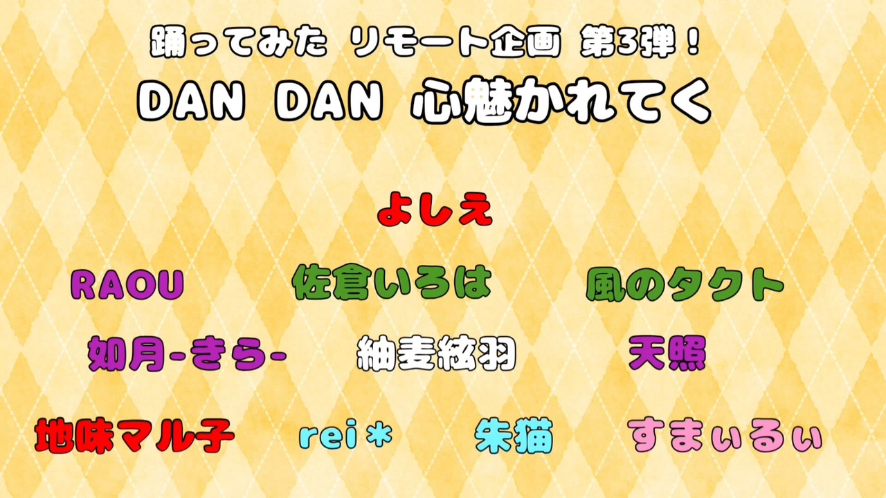 <br>リモートコラボ企画 第3弾です( *´艸`)<br>今回も素敵なメンバーとコラボさせて頂きました!<br>ご参加ありがとうございます♪<br><br>☆-☆-☆-☆-☆-☆-☆-☆<br><br>楽曲本家:<a href="https://www.youtube.com/watch?v=f7Z3b_vSjS8&list=RDf7Z3b_vSjS8" target="_blank" rel="noopener nofollow">https://www.youtube.com/watch?v=f7Z3b_vSjS8&list=RDf7Z3b_vSjS8</a><br>振付本家:よしえ(<a href="https://www.nicovideo.jp/watch/sm45469867" class="watch">sm45469867</a>)<br><br><br>【踊ってる人】<br><br>♡よしえ<br>・<a href="https://x.com/YoSHie_SIGN" target="_blank" rel="noopener nofollow">https://x.com/YoSHie_SIGN</a><br>・<a href="https://www.nicovideo.jp/mylist/67032563" target="_blank" rel="noopener">mylist/67032563</a><br><br>♡RAOU<br>・<a href="https://x.com/RAOOOOOUGONG" target="_blank" rel="noopener nofollow">https://x.com/RAOOOOOUGONG</a><br>・<a href="https://www.youtube.com/channel/UCOvaIzg1I2k7cVP5rmKKlvw" target="_blank" rel="noopener nofollow">https://www.youtube.com/channel/UCOvaIzg1I2k7cVP5rmKKlvw</a><br><br>♡佐倉いろは<br>・<a href="https://x.com/09cherry_cherry" target="_blank" rel="noopener nofollow">https://x.com/09cherry_cherry</a><br>・<a href="https://www.youtube.com/@%E4%BD%90%E5%80%89%E3%81%84%E3%82%8D%E3%81%AF" target="_blank" rel="noopener nofollow">https://www.youtube.com/@%E4%BD%90%E5%80%89%E3%81%84%E3%82%8D%E3%81%AF</a><br><br>♡風のタクト<br>・<a href="https://x.com/kazetakumana" target="_blank" rel="noopener nofollow">https://x.com/kazetakumana</a><br><br>♡如月-きら-<br>・<a href="https://x.com/KI2RA28" target="_blank" rel="noopener nofollow">https://x.com/KI2RA28</a><br><br>♡紬麦絃羽<br>・<a href="https://x.com/itoha_yarn_wing" target="_blank" rel="noopener nofollow">https://x.com/itoha_yarn_wing</a><br>・<a href="https://www.nicovideo.jp/mylist/75236272" target="_blank" rel="noopener">mylist/75236272</a><br><br>♡天照<br>・<a href="https://x.com/amachamp_" target="_blank" rel="noopener nofollow">https://x.com/amachamp_</a><br>・<a href="https://www.nicovideo.jp/mylist/68181960" target="_blank" rel="noopener">mylist/68181960</a><br><br>♡地味マル子<br>・<a href="https://x.com/jimimaruko_4869" target="_blank" rel="noopener nofollow">https://x.com/jimimaruko_4869</a><br>・<a href="https://www.nicovideo.jp/mylist/72233068" target="_blank" rel="noopener">mylist/72233068</a><br><br>♡rei*<br>・<a href="https://x.com/dance076hkkn" target="_blank" rel="noopener nofollow">https://x.com/dance076hkkn</a><br>・<a href="https://www.instagram.com/rei073/?igsh=eDdxNDJraWx5Zncw#" target="_blank" rel="noopener nofollow">https://www.instagram.com/rei073/?igsh=eDdxNDJraWx5Zncw#</a><br><br>♡朱猫<br>・<a href="https://x.com/CC_aka_" target="_blank" rel="noopener nofollow">https://x.com/CC_aka_</a><br>・<a href="https://www.nicovideo.jp/mylist/64564175" target="_blank" rel="noopener">mylist/64564175</a><br><br>♡すまぃるぃ<br>・<a href="https://x.com/rui_smile_SL" target="_blank" rel="noopener nofollow">https://x.com/rui_smile_SL</a><br>・<a href="https://www.nicovideo.jp/mylist/78065584" target="_blank" rel="noopener">mylist/78065584</a><br><br>