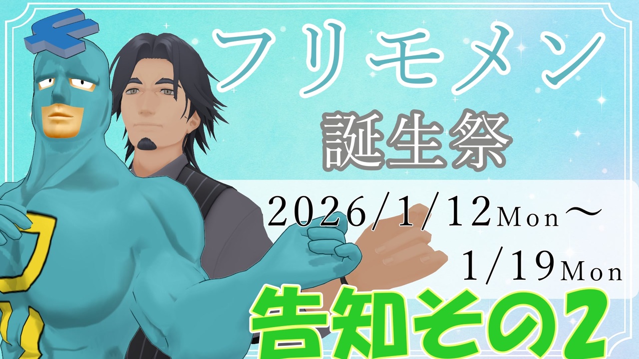 <span style="font-size: 16px;">日時:2026年1月12日(月)~19日(月) </span><br><br>・お題はフリモメンに関するものなら何でもOK <br> <span style="font-size: 16px;"><strong>フリモメン誕生祭2026</strong></span><br>をタグロックしてくれ!<br>また誕生祭向けに素材作成いただいた方はよければ<br><span style="font-size: 16px;"><strong> フリモメン誕生祭2026前夜祭</strong></span><br>をタグロックしてくれると助かる!<br><br>例として、以下のようなジャンルを想定<br><br>投稿ジャンル1,フリモメンキャラ動画 (フリモメンが出てくる動画ならなんでも)<br>投稿ジャンル2,フリモメシ(青い食品、料理) <br>投稿ジャンル3,フリモソング(Synthesizer Vなどを使ったおうたの動画)<br>投稿ジャンル4,なりきりフリモメン(フリモメンTシャツでも全身タイツでもなんでもかんでも)<br>投稿ジャンル5,タオルの人(タカスィー)部門 (タオルの人(タカスィー)が出るならなんでも)<br>投稿ジャンル6,フリモアート (モメンズアート、支援絵などなど、静画にお願いします)<br><br><span style="font-size: 16px;">☆タオルの人の素材作成いただいています!!!!</span><br>九段はくりさん :<br><a href="https://seiga.nicovideo.jp/seiga/im11680394" target="_blank" rel="noopener nofollow">https://seiga.nicovideo.jp/seiga/im11680394</a><br>一ツ目西瓜さん:<br><a href="https://seiga.nicovideo.jp/seiga/im11680769" target="_blank" rel="noopener nofollow">https://seiga.nicovideo.jp/seiga/im11680769</a><br>素材はマイリスに追加していくぞ!!<br><a href="https://seiga.nicovideo.jp/clip/3468643" target="_blank" rel="noopener nofollow">https://seiga.nicovideo.jp/clip/3468643</a><br><br>なお、再生数がいちばん多かった方にパッケージ版voicepeakプリモメンをプレゼント<br>(主催主の自前、これ用に新規購入のパッケージ版。)<br><br>どしどし投稿待ってるぜ! <br><br>禁止事項 :<br>・著しく公序良俗に反するもの(基本的には大丈夫なはずです)<br>・ニコニ広告以外で、外部の業者などによる再生数増加行為を行うこと<br> (主催が勝手に失格などの判断はしませんが、SNSで判断を仰ぐ可能性はあります)<br><br>主催:<br><a href="https://twitter.com/nanashinico1" target="_blank" rel="noopener nofollow">https://twitter.com/nanashinico1</a><br><a href="https://bsky.app/profile/nanashinico1.bsky.social" target="_blank" rel="noopener nofollow">https://bsky.app/profile/nanashinico1.bsky.social</a><br><br /><br>動画で出てきたオブジェ地図: <a href="https://www.google.com/maps/d/u/1/edit?mid=16PEZB91ajQMr3jLb74_ph9XdZN7svlI&usp=sharing" target="_blank" rel="noopener nofollow">https://www.google.com/maps/d/u/1/edit?mid=16PEZB91ajQMr3jLb74_ph9XdZN7svlI&usp=sharing</a><br><br><br><br><a target="_blank" href="https://qa.nicovideo.jp/faq/show/19424?site_domain=default" style="font-size: 13px;color: #657586; text-decoration: underline; line-height: 1.4">この動画は投稿者によって修正されました</a>