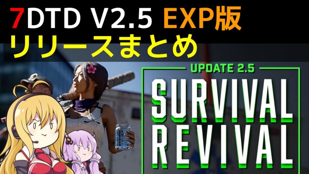 7 Days To DieのV2.5 EXP版のリリースまとめです。<br><br>Youtubeのチャンネルはこちら 登録してくれると嬉しいです!<br><a href="https://youtu.be/s9jZUmTwQYk" target="_blank" rel="noopener nofollow">https://youtu.be/s9jZUmTwQYk</a><br><br><a href="#" class="seekTime" data-seekTime="00:007" onclick="seekNicoPlayer('#00:007'); return false;">#00:007</a>dtd V2.5 EXP版リリース!!<br><a href="#" class="seekTime" data-seekTime="02:38" onclick="seekNicoPlayer('#02:38'); return false;">#02:38</a>空き瓶復活による飲料関係の改善<br><a href="#" class="seekTime" data-seekTime="05:08" onclick="seekNicoPlayer('#05:08'); return false;">#05:08</a>車両ストレージ容量の拡張および車両Modシステム<br><a href="#" class="seekTime" data-seekTime="05:57" onclick="seekNicoPlayer('#05:57'); return false;">#05:57</a>新しいロアフレンドリーなゾンビの導入<br><a href="#" class="seekTime" data-seekTime="06:30" onclick="seekNicoPlayer('#06:30'); return false;">#06:30</a>プレイヤーの活動に基づいた新しい臭いシステム<br><a href="#" class="seekTime" data-seekTime="08:42" onclick="seekNicoPlayer('#08:42'); return false;">#08:42</a>嵐のリニューアル<br><a href="#" class="seekTime" data-seekTime="11:05" onclick="seekNicoPlayer('#11:05'); return false;">#11:05</a>養蜂箱や蜂蜜料理の実装<br><a href="#" class="seekTime" data-seekTime="12:083" onclick="seekNicoPlayer('#12:083'); return false;">#12:083</a>人称視点のサポート<br><a href="#" class="seekTime" data-seekTime="12:43" onclick="seekNicoPlayer('#12:43'); return false;">#12:43</a>タレット弾薬システムの改善<br><a href="#" class="seekTime" data-seekTime="13:19" onclick="seekNicoPlayer('#13:19'); return false;">#13:19</a>トレーダークエスト選定ロジックの改善<br><a href="#" class="seekTime" data-seekTime="14:52" onclick="seekNicoPlayer('#14:52'); return false;">#14:52</a>新しいUIの実装<br><a href="#" class="seekTime" data-seekTime="15:12" onclick="seekNicoPlayer('#15:12'); return false;">#15:12</a>その他の細々とした修正<br><br>【注意】<br>本動画は7 Days To Die V2.5 について解説しています<br>いつものように未確定で変更される可能性があること<br>残酷な描写・ネタバレを含むこと<br>ガバ翻訳で間違えている可能性があることをご承知おきください<br><br>もしよろしければ、チャンネル登録やいいねをお願いします!<br><br>【エラータ】<br>何かあれば追加します。