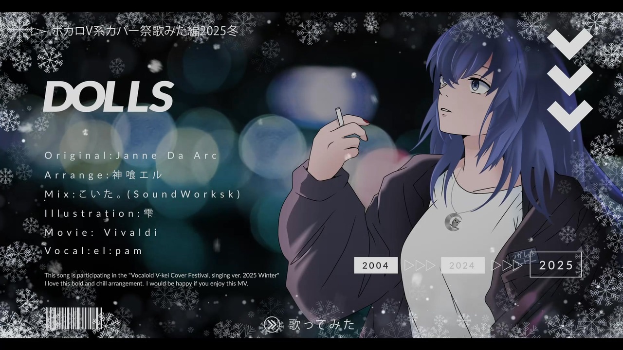 <span style="color: #9900ff;"><strong>ボカロV系カバー祭歌みた編2025冬 参加曲</strong></span><br><br>Janne Da Arc 様の DOLLS を神喰エル 様の素敵なアレンジ(「ボカロV系カバー祭2024秋」参加曲)で歌わせていただきました❅*<br><br>MVは、Janne Da Arc様と神喰エル様の両方の要素を取り入れて制作していただきました!!<br>サビ、1番と2番で歌い方を少し変えてみてますので、そのあたりも含めてぜひ最後までお楽しみいただけたら嬉しいです😊✨<br><br>余談ですが、実は・・・・・「Janne Da Arc」 知りませんでした💦<br>神喰エル様のアレンジバージョンをたまたま拝聴して、とても好きだな!と思ったのがきっかけで<br>ご本家様のMVも見てみよう...といった流れです💦<br>かっこいいですよね😳✨<br>そしてちなみに、自分はタバコを吸わないため、、、<br>イラストを描いてくれた雫さんのアイデアで、お菓子のタバコ持たせてます笑<br><br>key -2<br><br>コピペ用 ↓<br><br>✰⋆。:゚・*❅:゚・❄︎⋆。✰⋆。:゚・*❅:゚・❄︎⋆。✰⋆。:゚・*❅:゚・❄︎⋆。<br><br><br>• ━━━━━━ • ∙ʚ🦉ɞ∙ • ━━━━━━ • <br><br>❖ Original DOLLS / Janne Da Arc <br>Y ▶ <a href="https://www.youtube.com/watch?v=C7cOK8htmvc" target="_blank" rel="noopener nofollow">https://www.youtube.com/watch?v=C7cOK8htmvc</a> <br><br>❖ Arrange ver. DOLLS / Janne Da Arc 【Covered by 神喰エル feat.Mai】<br><a href="https://www.nicovideo.jp/watch/sm44378124" class="watch">sm44378124</a><br>Y ▶ <a href="https://www.youtube.com/watch?v=09dHCjrU7QA" target="_blank" rel="noopener nofollow">https://www.youtube.com/watch?v=09dHCjrU7QA</a> <br><br>• ━━━━━━ • ∙ʚ🦉ɞ∙ • ━━━━━━ • <br><br>Mix : koita(SoundWorksk) <br><a href="https://x.com/KOITA_SWK" target="_blank" rel="noopener nofollow">https://x.com/KOITA_SWK</a> <br><br>Illustration:雫 <br><a href="https://x.com/ke65037234" target="_blank" rel="noopener nofollow">https://x.com/ke65037234</a> <br><br>Movie : Vivaldi <br><a href="https://x.com/vivaldi_wd" target="_blank" rel="noopener nofollow">https://x.com/vivaldi_wd</a> <br><br>Vocal : el:pam <br><a href="https://x.com/elpam_uta" target="_blank" rel="noopener nofollow">https://x.com/elpam_uta</a><br><br>• ━━━━━━ • ∙ʚ🦉ɞ∙ • ━━━━━━ • <br><br>twiplaのリンク(<a href="https://twipla.jp/events/687685)" target="_blank" rel="noopener nofollow">https://twipla.jp/events/687685)</a>