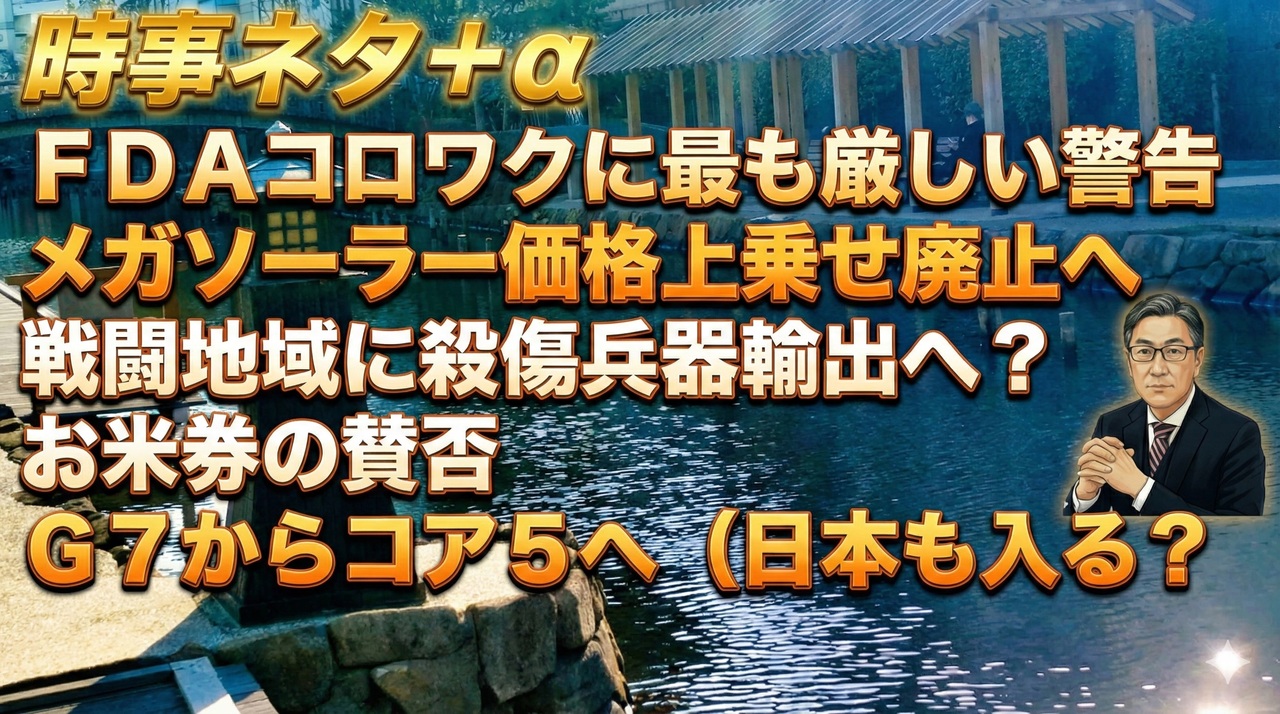 ◆原口一博<br>【速報】米国FDA、コロナワクチンに「最も厳しい警告」を表示へ<br>CNNが報じました(2025.12.12)。<br><br><br>2025.12.15リチャード・コシミズ・チャンネル第118回<br>•マイナカードは、中国の「社会信用スコア」制度の日本版。国民を政府に無抵抗にさせる手段。恐怖政治<br><br>◆トモ農園<br>お米券批判で日本農業が潰れる?<br><br>◆失敗小僧<br>須田信一郎氏が釈明 立花孝志氏の前に兵庫県議に関する警察の動きを動画発信した事について<br><br>◆カナダ人ニュース<br>12.12 G7解体計画・C5構想が流出<br><br>◆古舘伊知郎<br>JA優遇か。評判悪過ぎる『お米券』配布は誰のため?農業政策の大転換期。<br><br>◆及川幸久<br>【ニコ生】12/14(日) キャンディス・オーエンズ、タッカー・カールソンが語るチャーリー・カーク暗◯の真相 及川幸久The Wisdom LIVE Channel#183<br><br>崩壊し放置されている太陽光発電所はこれだけでは無いが、ここまで酷いとは<br><br>新規メガソーラー、電力買い取り価格上乗せ廃止へ…消費者が支払う再エネ賦課金が原資<br><br>◆野口健<br>ようやく国が動き出しました。せめてあと10年早くやっていてくれていたら救えた自然も多かっただろうに。とはいえ感謝、感謝、感謝。来年は駆け込みがエグそう…。<br><br>長野県でソーラーパネルの地面にゴミや太陽光パネルが埋められていたようです。。<br><br>石炭火力の廃止が延期へ。最先端のAIが時代遅れのエネルギーを呼び戻す<br><br>◆浅村正樹<br>(ホイップクリームサンドイッチ)こないだコンビニでこれ見つけた時、「日本は貧民の国になったんだ」と思ったわ。<br><br>【戦闘が行われている国への殺傷兵器輸出、自民が維新と検討へ】<br><br>議員定数削減法案は成立困難…高市首相と維新・吉村氏があす党首会談 補正予算案はあす成立の見込み<br><br>日本を多極型世界に引き入れるトランプ<br>2025年12月14日 田中宇<br><br>トランプ米大統領、経済に弱気? 中間選挙「有権者に響くか不明」<br><br>高市首相は農水省にダマされている…鈴木農水大臣が「おこめ券」の次に仕掛ける"サイレント減反"の中身<br><br>#core5<br>#お米券<br>#田中宇<br>#議員定数削減<br>#再エネ賦課金<br>#メガソーラー<br>#野口健<br>#失敗小僧<br>#及川幸久
