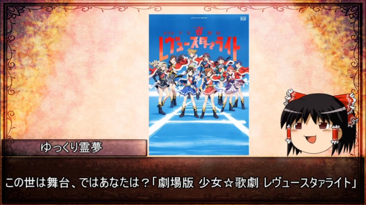 なるべくアニメそのものの展開のネタバレや、キャラの激しいネタバレは避けていく新規にもやさしい仕様で好きなアニメを推していきます。<br><br>語りそびれてるところがあれば、むしろコメントで埋めてもらいたいぐらいだよ!<br><br><br>今回は、舞台に生きる少女たちが織りなす最終章。<br>友と別れ、過去を燃やし、やり尽くしてもなお終わらない舞台人生の物語だよ。<br><br>リアルタイムでのTLで、純那ちゃんIFルート大喜利が盛り上がってたのはいい思い出。<br>現状、最も本作と近似値を示す作品は「大長編タローマン 万博大爆発」だと思ってるんですが、<br>検索したら同じこと考えてる人がいて安心しました。<br>【前 】【次 <strong><u>贔屓のバンダイチャンネルくんが復活したら……</u></strong>】<br>お慈悲はこちら→<a href="https://naraku-yoko.fanbox.cc/" target="_blank" rel="noopener nofollow">https://naraku-yoko.fanbox.cc/</a><br><br>一部効果音:On-Jin ~音人~(斬り刻む音)OtoLogic(スポットライト)<br><br>特報 <a href="https://www.youtube.com/watch?v=gteAyeBKGfU" target="_blank" rel="noopener nofollow">https://www.youtube.com/watch?v=gteAyeBKGfU</a><br>本編 <a href="https://www.nicovideo.jp/watch/so42691631" class="watch">so42691631</a><br><br><a target="_blank" href="https://qa.nicovideo.jp/faq/show/19424?site_domain=default" style="font-size: 13px;color: #657586; text-decoration: underline; line-height: 1.4">この動画は投稿者によって修正されました</a>