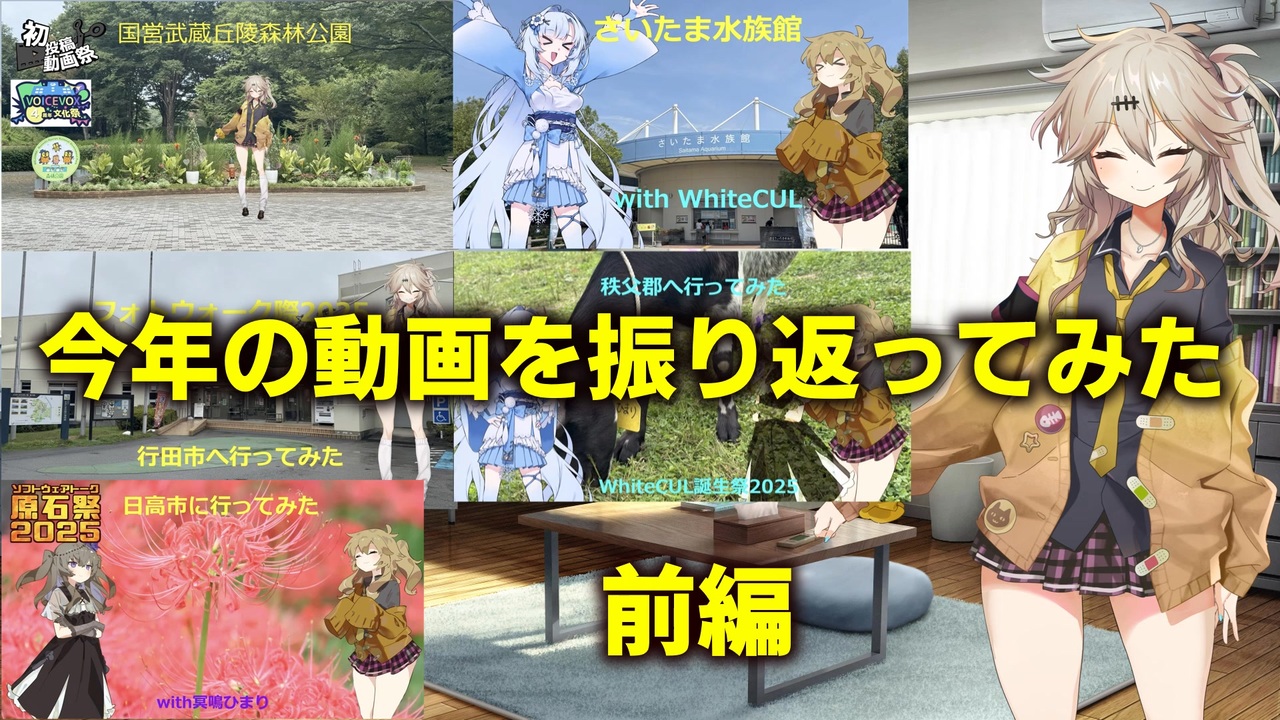 そろそろ今年もあとわずかということで今年初投稿してからの計10本の動画を振り返っていこうという企画の前編です<br><br>使用ツール<br>ゆっくりムービーメーカー4<br><br>音声<br>VOICEVOX:春日部つむぎ<br> WhiteCUL<br> 冥鳴ひまり<br><br>立ち絵<br>春日部つむぎ立ち絵素材 春日部つくし様<br>立ち春日部つむぎ素材 akihiyo様<br>ver.1.0立ち絵素材なWhiteCULさん 聡間まこと様<br>冥鳴ひまり立ち絵素材 とらっかぁ様<br><br>背景<br>一人部屋3(日中) みんちりえ様<br><br>BGM<br>morning DOVAーSYNDROME しゃろう様<br>野良猫は宇宙を目指した DOVAーSYNDROME しゃろう様 <br>パステルハウス DOVAーSYNDROME かずち様<br><br>効果音<br>放送開始チャイム 効果音ラボ様<br>カタカタ震える 効果音ラボ様<br>木のドアをノック1 効果音ラボ様<br>ドアを開ける1 効果音ラボ様<br>ドアを閉める1 効果音ラボ様<br>【効果音】出現・魔法 ニコニ・コモンズ あいとも様<br><br>他<br>カットイン/演出/背景動画素材/闇/カオス/混乱(その11) ニコニ・コモンズ 染屋様<br><br>出典<br>羽生水郷公園古式ホームページ <a href="https://www.parks.or.jp/suizokukan/guide/001/001223.html" target="_blank" rel="noopener nofollow">https://www.parks.or.jp/suizokukan/guide/001/001223.html</a><br><br><br>