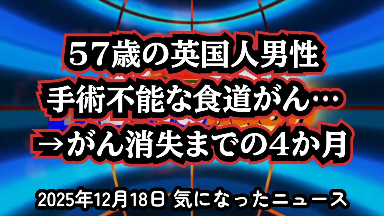 【がん治療】◆57歳の英国人男性、手術不能な食道がん・・・がん消失までの4か月【ウイリアム・マキス博士】<br><br>『手術不能→がん消失まで4か月|食道がん症例』<br><br>あらすじ<br>57歳の英国人男性が食道がんと診断された。転移は確認されなかったものの、2025年3月時点で医師からは『手術はできない』と判断される。選択肢が限られる中、彼は病院での標準治療を受けながら、既存薬の再目的化という別のアプローチにも目を向けた。<br>それから4か月後、状況は大きく動く。腫瘍の状態が変化し、当初は不可能とされた治療の可能性が再び検討されることになった。<br>本動画では、初期段階のがんにおいて『治療前に何が行われ、なぜ注目されたのか』を、結果を断定せず、経過と背景に焦点を当てて整理する。個人の体験談が示す一つの事例として、医療と選択の間にある現実を静かに見つめる内容である。<br><br>◆今回の台本&詳細<a href="https://keiichiro8140.hatenablog.com/entry/25121888111" target="_blank" rel="noopener nofollow">https://keiichiro8140.hatenablog.com/entry/25121888111</a><br><br>◆これまでの動画<a href="https://x.gd/sPXoJ" target="_blank" rel="noopener nofollow">https://x.gd/sPXoJ</a><br><br>◆もしも(BAN)の時のためのマイリンク集<a href="https://lit.link/K-16_News44" target="_blank" rel="noopener nofollow">https://lit.link/K-16_News44</a><br><br>食道がん<br>手術不能から回復<br>FLOT療法<br>イベルメクチン癌<br>フェンベンダゾール<br>CBDオイル<br>変性シトラスペクチン<br>がん治療<br>ウイリアム・マキス博士<br>腫瘍縮小<br>体験談<br><br>ご覧いただきありがとうございます<br>m(_ _)m<br><br>気になったニュース 2025/12/18<br><br />著作権、肖像権に配慮して作成しております。<br><br>◆気になったニュースの台本!?<br>メモ代わりに作った台本をそのままあげてます<br><a href="https://keiichiro8140.hatenablog.com/." target="_blank" rel="noopener nofollow">https://keiichiro8140.hatenablog.com/.</a><br><br><br>ここからはシリーズ紹介<br><br><br>◆ ワクチン解毒・デトックス<br><a href="https://x.gd/fZweg" target="_blank" rel="noopener nofollow">https://x.gd/fZweg</a><br><br>◆ウイリアム・マキス博士のがん治療(イベルメクチン・フェンベンダゾール等)<br><a href="https://x.gd/AtFYS" target="_blank" rel="noopener nofollow">https://x.gd/AtFYS</a><br><br>◆予防接種健康被害救済制度<br><a href="https://x.gd/0xK9x" target="_blank" rel="noopener nofollow">https://x.gd/0xK9x</a><br><br>◆気になったニュース #1501~<br><br>◆ 【ショートver】気になったニュース<br><a href="https://x.gd/7MxXC" target="_blank" rel="noopener nofollow">https://x.gd/7MxXC</a><br><br>◆ 気になったニュース #1001~<br><a href="https://x.gd/Lp8gv" target="_blank" rel="noopener nofollow">https://x.gd/Lp8gv</a><br><br>◆ 気になったニュース #501~<br><a href="https://x.gd/EmbS4" target="_blank" rel="noopener nofollow">https://x.gd/EmbS4</a><br><br>◆ 気になったニュース #1~#500<br><a href="https://x.gd/uPhNb" target="_blank" rel="noopener nofollow">https://x.gd/uPhNb</a><br><br>◆ X(旧Twitter)・テレグラムで気になった情報<br><a href="https://x.gd/YG6FT" target="_blank" rel="noopener nofollow">https://x.gd/YG6FT</a><br><br>◆ 日比谷5万人パレードデ⚪生放送アーカイブ動画<br><a href="https://x.gd/3CHJv" target="_blank" rel="noopener nofollow">https://x.gd/3CHJv</a><br><br>◆日比谷5万人パレード⚪モのマイリスト作ってみました<br><a href="https://nico.ms/mylist/76828848?ref=sp_other" target="_blank" rel="noopener nofollow">https://nico.ms/mylist/76828848?ref=sp_other</a><br><br>◆3.30 令和の百姓⚪⚪<br><a href="https://www.nicovideo.jp/series/511791?ref=garage_share_other" target="_blank" rel="noopener nofollow">https://www.nicovideo.jp/series/511791?ref=garage_share_other</a><br><br>◆ 及川幸久さんの【XNEWS】シリーズ<br><a href="https://x.gd/3k78K" target="_blank" rel="noopener nofollow">https://x.gd/3k78K</a><br><br>◆これまでの動画<a href="https://x.gd/sPXoJ" target="_blank" rel="noopener nofollow">https://x.gd/sPXoJ</a><br><br>◆もしも(BAN)の時のためのマイリンク集<a href="https://lit.link/K-16_News44" target="_blank" rel="noopener nofollow">https://lit.link/K-16_News44</a><br><br>