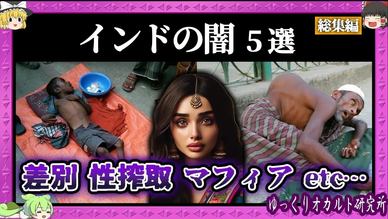 美少女は性奴隷として召し上げ、子供の手足や目を潰してまで物乞いに。そして権力や経済力だけでなく、宗教面からも抑圧する絶望的な格差。常軌を逸した理不尽さが今も続くインドについて、【 ゆっくり解説 総集編 インド 】としてゆっくり茶番劇スタイルでお届けします。 00:00 目次 00:35 カースト制度 究極の残酷差別 10:30 美少女を寺に奉納して性搾取 18:42 生きたまま焼かれる妻の風習 サティ 26:16 子どもを障害者にして物乞い レンタルチャイルド 34:47 世界を牛耳る 砂マフィア 43:50 まとめと究極どうでもいい話 <br>★関連動画はこちらから! <a href="https://youtube.com/@ゆっくりオカルト研究所" target="_blank" rel="noopener nofollow">https://youtube.com/@ゆっくりオカルト研究所</a> ★気まずすぎる動画はメンバーシップで…→ <a href="https://www.youtube.com/channel/UCirxRvghHohWx9iWLKYuceg/join" target="_blank" rel="noopener nofollow">https://www.youtube.com/channel/UCirxRvghHohWx9iWLKYuceg/join</a> ★規制されてしまった動画・オリジナル動画等あり!裏オカ研(サブスク):再生リスト「裏のアレ」→ <a href="https://mediable.jp/playlists/c98143a6-4a92-4337-9325-e15eadaab6e2" target="_blank" rel="noopener nofollow">https://mediable.jp/playlists/c98143a6-4a92-4337-9325-e15eadaab6e2</a> #ゆっくり解説#インド#カースト制度#デーヴァダーシー#砂マフィア#風習 ※この動画は、過去に起きた事件などから、現代でも起こりうるリスク・教訓を伝えるための情報の伝達を主な目的としており、視聴者に衝撃を与えて扇動する目的はございません。 ※科学では説明の付かないオカルト・心霊・超常現象なども取り扱うことがありますが、同様に視聴者に衝撃を与えて扇動する目的はございません。 ※ゆっくり解説・ゆっくり茶番劇のスタイルを取っておりますが、動画での惨事や死を取り扱う内容については、関係者を冒涜したり、その行動を助長したりするといった意図はございません。 ※動画内の素材はすべて引用であり、著作権や肖像権を侵害する目的はございません。