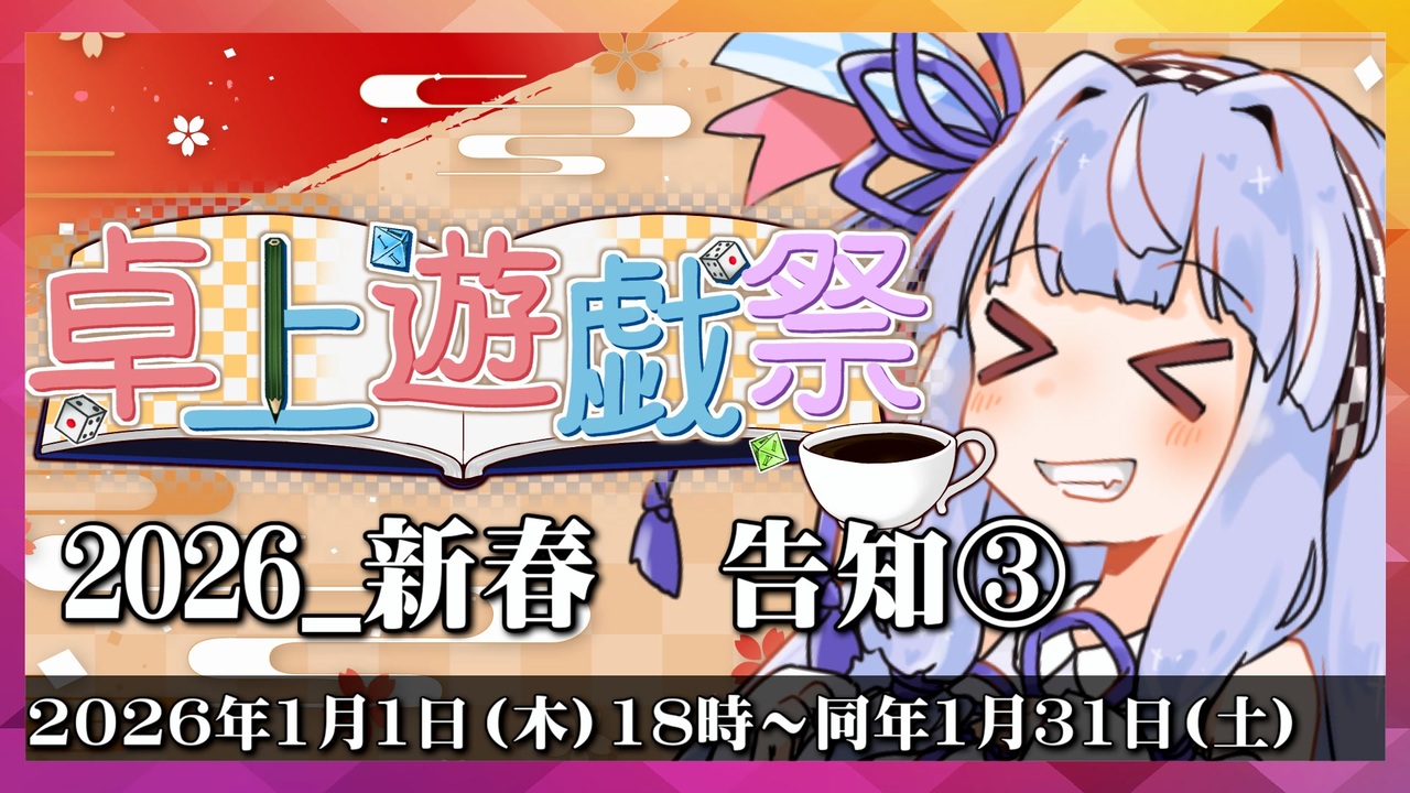 残り半月を切ったので最後のリマインド動画<br><span style="font-size: 16px;">開催告知動画:<a href="https://www.nicovideo.jp/watch/sm45467176" class="watch">sm45467176</a><br>開催告知動画②:<a href="https://www.nicovideo.jp/watch/sm45627626" class="watch">sm45627626</a></span><br><br><br><span style="font-size: 16px;"><strong>開催趣旨</strong></span><br>音声合成ソフトのキャラクター箱推しでTRPG大好きな投稿者Cafe院がもっと動画が見たい! TRPGやボドゲなどのアナログゲームジャンルの動画増えろ増えろ!<br>と思って企画しました。<br><br><span style="font-size: 16px;"><strong>題材</strong></span><br>VOICEROID、CeVIO等の音声合成ソフトによるアナログゲーム(TRPG、ソロジャーナル、ボードゲームなど)投稿祭<br>動画内容について<br>セッションのリプレイ(仮想卓含む)や嘘予告、推しシステム、ボードゲーム等の紹介も可<br><br><span style="font-size: 18px;"><strong>開催期間</strong></span><br><span style="font-size: 18px;">2026年1月1日(木)</span><span style="font-size: 18px;"><strong>18時</strong></span><span style="font-size: 18px;">~2025年1月31日(土)23時59分まで</span><br><br><span style="font-size: 16px;">他レギュレーションなどは動画本編またはこちらのnoteから参照をお願いします。</span><br><a href="https://note.com/cafein9610/n/nab9905fd9299?sub_rt=share_sb" target="_blank" rel="noopener nofollow">https://note.com/cafein9610/n/nab9905fd9299?sub_rt=share_sb</a><br><br><br><span style="font-size: 18px;">皆さんの参加お待ちしてます!!!!!!!!</span><br><br><span style="font-size: 16px;"><strong>投稿祭ロゴ→<a href="https://commons.nicovideo.jp/works/nc430827" target="_blank" rel="noopener">nc430827</a></strong></span><br><br><span style="font-size: 16px;">【Cafe院9610の連絡先】</span><br>X(旧Twitter)→<a href="https://twitter.com/CafeIN9610" target="_blank" rel="noopener nofollow">https://twitter.com/CafeIN9610</a><br>動画などの質問を受け付けてるやつ→<a href="https://mond.how/ja/CafeIN9610" target="_blank" rel="noopener nofollow">https://mond.how/ja/CafeIN9610</a><br /><br><strong>立ち絵やコモンズ素材など</strong>:コンテンツツリー参照<br><br><span style="font-size: 18px;"><strong>最新動画</strong></span><br>【ボイロTRPG】ハルーラ様と冒険者。「初冒険編」EX回【実卓リプレイ】 :<a href="https://www.nicovideo.jp/watch/sm45819095" class="watch">sm45819095</a><br><span style="font-size: 18px;"><strong>マイリスト・シリーズ</strong></span><br>シリーズ動画Part1集:<a href="https://www.nicovideo.jp/mylist/66823556" target="_blank" rel="noopener">mylist/66823556</a><br>ボイロTRPGpart1リスト:<a href="https://www.nicovideo.jp/mylist/77484044" target="_blank" rel="noopener">mylist/77484044</a><br>小樽潮風高校TRPG部(潮風卓):<a href="https://www.nicovideo.jp/mylist/78763199" target="_blank" rel="noopener">mylist/78763199</a><br>あおタカ:<a href="https://www.nicovideo.jp/series/77695" target="_blank" rel="noopener">series/77695</a><br>アリアルさん:<a href="https://www.nicovideo.jp/series/324423" target="_blank" rel="noopener">series/324423</a><br>合作まとめ:<a href="https://www.nicovideo.jp/mylist/73765421" target="_blank" rel="noopener">mylist/73765421</a><br>単発・劇場:<a href="https://www.nicovideo.jp/series/454284" target="_blank" rel="noopener">series/454284</a><br>単発・TRPG:<a href="https://www.nicovideo.jp/series/454282" target="_blank" rel="noopener">series/454282</a><br>単発・その他まとめ:<a href="https://www.nicovideo.jp/series/77328" target="_blank" rel="noopener">series/77328</a><br><br><span style="font-size: 18px;"><strong>【Cafe院の連絡先】</strong></span><br>Twitter→<a href="https://twitter.com/CafeIN9610" target="_blank" rel="noopener nofollow">https://twitter.com/CafeIN9610</a><br>動画などの質問を受け付けてるやつ→<a href="https://mond.how/ja/CafeIN9610" target="_blank" rel="noopener nofollow">https://mond.how/ja/CafeIN9610</a><br>動画などの質問を受け付けてるマシュマロ→<a href="https://marshmallow-qa.com/cafein9610?utm_medium=url_text&utm_source=promotion" target="_blank" rel="noopener nofollow">https://marshmallow-qa.com/cafein9610?utm_medium=url_text&utm_source=promotion</a><br>干芋:<a href="https://www.amazon.jp/hz/wishlist/ls/2KVT8NHDPXNI2?ref_=wl_share" target="_blank" rel="noopener nofollow">https://www.amazon.jp/hz/wishlist/ls/2KVT8NHDPXNI2?ref_=wl_share</a>