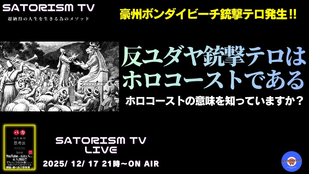 ■有料会員制 動画チャンネル「SATORISM GOLDEN TV」<br>特別動画配信中!<br>入会はコチラ <a href="https://nicochannel.jp/satorism-premium/welcome" target="_blank" rel="noopener nofollow">https://nicochannel.jp/satorism-premium/welcome</a><br><br>■有料会員様でログインできない等の不具合がある会員様へ<br>ドワンゴ苦情窓口はコチラ <a href="https://help.nicochannel.jp/hc/ja/requests/new?ticket_form_id=4414714831513" target="_blank" rel="noopener nofollow">https://help.nicochannel.jp/hc/ja/requests/new?ticket_form_id=4414714831513</a><br><br>■ANGLE磁気ネックレス 公式オンラインショップ<br><a href="https://c.affitch.com/?ref=PM9XTQJ6QGME" target="_blank" rel="noopener nofollow">https://c.affitch.com/?ref=PM9XTQJ6QGME</a><br><br>■合法アドレノクロム説明会をご希望の方 <a href="https://satorism-tv.com/home/contact/" target="_blank" rel="noopener nofollow">https://satorism-tv.com/home/contact/</a><br><br>■イベント情報<br>NEW!!2025年12月27日(土)サトリズム歴史考察『広島長崎の9.11』in松江市<br>チケット予約はコチラ <a href="https://satorism1127.peatix.com" target="_blank" rel="noopener nofollow">https://satorism1127.peatix.com</a><br><br>NEW!!2025年12月28日(日)サトリズム歴史考察『広島長崎の9.11』in広島市<br>チケット予約はコチラ <a href="https://satorism1128.peatix.com" target="_blank" rel="noopener nofollow">https://satorism1128.peatix.com</a><br><br>NEW!!2025年12月29日(月)サトリズム歴史考察『広島長崎の9.11』in松山市<br>チケット予約はコチラ <a href="https://satorism1229.peatix.com" target="_blank" rel="noopener nofollow">https://satorism1229.peatix.com</a><br><br>NEW!!2025年12月21日(日)サトリズム歴史考察『悪魔のシナゴーグ』in新大阪<br>チケット予約はコチラ <a href="https://peatix.com/event/4650856" target="_blank" rel="noopener nofollow">https://peatix.com/event/4650856</a><br>※合法アドレノクロム会員は入場無料!要予約<br><br>NEW!!2026年1月12日(祝)博士とサトリズムの近未来講座in大阪<br><br>講演会チケットはコチラ <a href="https://seminar20260112.peatix.com/" target="_blank" rel="noopener nofollow">https://seminar20260112.peatix.com/</a><br><br>懇親会チケットはコチラ <a href="https://party20260112.peatix.com/" target="_blank" rel="noopener nofollow">https://party20260112.peatix.com/</a>