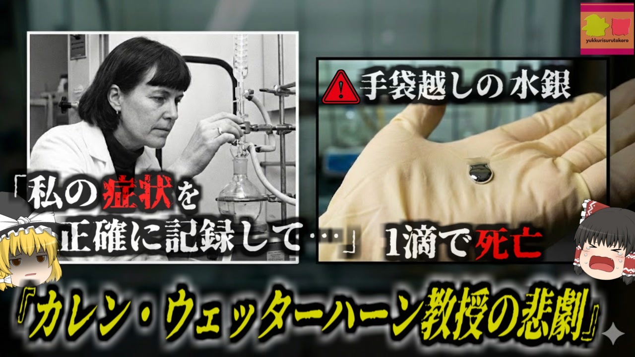 <a href="#" class="seekTime" data-seekTime="00:07" onclick="seekNicoPlayer('#00:07'); return false;">#00:07</a> 本編開始<br><a href="#" class="seekTime" data-seekTime="00:23" onclick="seekNicoPlayer('#00:23'); return false;">#00:23</a> Karen Wetterhahn<br><a href="#" class="seekTime" data-seekTime="00:55" onclick="seekNicoPlayer('#00:55'); return false;">#00:55</a> 彼女の研究分野<br><a href="#" class="seekTime" data-seekTime="2:34" onclick="seekNicoPlayer('#2:34'); return false;">#2:34</a> DNA修復と水銀の阻害メカニズム<br><a href="#" class="seekTime" data-seekTime="3:54" onclick="seekNicoPlayer('#3:54'); return false;">#3:54</a> 当日の実験と一滴の水銀<br><a href="#" class="seekTime" data-seekTime="5:01" onclick="seekNicoPlayer('#5:01'); return false;">#5:01</a> 異変<br><a href="#" class="seekTime" data-seekTime="6:01" onclick="seekNicoPlayer('#6:01'); return false;">#6:01</a> 通常の400倍もの水銀検出<br><a href="#" class="seekTime" data-seekTime="7:01" onclick="seekNicoPlayer('#7:01'); return false;">#7:01</a> 水銀が何故有害なのか<br><a href="#" class="seekTime" data-seekTime="9:41" onclick="seekNicoPlayer('#9:41'); return false;">#9:41</a> めまいや視野狭窄が現れるメカニズム<br><a href="#" class="seekTime" data-seekTime="10:52" onclick="seekNicoPlayer('#10:52'); return false;">#10:52</a> 原因が判明した経緯と彼女の記録<br><a href="#" class="seekTime" data-seekTime="12:24" onclick="seekNicoPlayer('#12:24'); return false;">#12:24</a> 教授は全ての安全策をとっていたが…<br><a href="#" class="seekTime" data-seekTime="12:52" onclick="seekNicoPlayer('#12:52'); return false;">#12:52</a> 再現実験で明らかになった新事実<br><a href="#" class="seekTime" data-seekTime="14:46" onclick="seekNicoPlayer('#14:46'); return false;">#14:46</a> 最後まで科学者として振舞ったカレン教授<br><a href="#" class="seekTime" data-seekTime="15:00" onclick="seekNicoPlayer('#15:00'); return false;">#15:00</a> 事故の多大なる影響と彼女の功績<br><br><br><br>引用・出展・参考文献(視聴者提供資料など<br>Wikipedia Karen Wetterhahn<br><a href="https://x.gd/p0s88" target="_blank" rel="noopener nofollow">https://x.gd/p0s88</a> <br><br />※この動画は過去の事件を知り、現在でも同じことが発生する危険性を再認識、関与しないように促すための動画であり、視聴者を扇動、動揺を誘うためのコンテンツではありません。<br><br>ご要望にお応えして、メンバーシップの開設を行いました。<br>下記URLからも登録可能ですので、ご興味がある方は是非ご参加ください。<br><a href="https://www.youtube.com/channel/UCcT5a1J7XJW7CLYI2RKl4pw/join" target="_blank" rel="noopener nofollow">https://www.youtube.com/channel/UCcT5a1J7XJW7CLYI2RKl4pw/join</a><br><br><br>Twitter<br>→<a href="https://twitter.com/yukkurisurutoko" target="_blank" rel="noopener nofollow">https://twitter.com/yukkurisurutoko</a><br><br>取り急ぎ、簡易的にですがマイリストを作りました。<br>【ゆっくり解説】事故・事件関係紹介リスト <br><a href="https://www.nicovideo.jp/mylist/71034319" target="_blank" rel="noopener nofollow">https://www.nicovideo.jp/mylist/71034319</a><br>【ゆっくり解説】放射線系事故<br><a href="https://www.nicovideo.jp/mylist/71034368" target="_blank" rel="noopener nofollow">https://www.nicovideo.jp/mylist/71034368</a><br>【ゆっくり解説】鉄道系事故・事件関連<br><a href="https://www.nicovideo.jp/mylist/71034379" target="_blank" rel="noopener nofollow">https://www.nicovideo.jp/mylist/71034379</a>