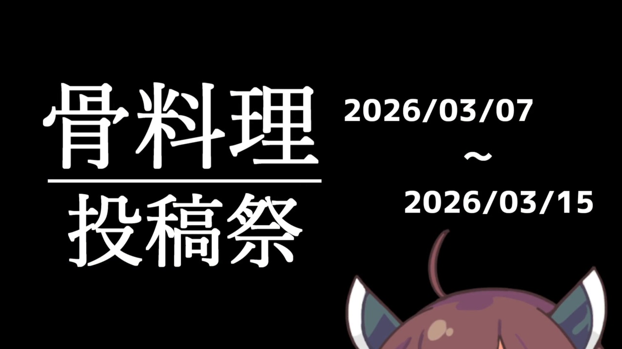 <span style="font-size: 18px;"><strong>骨料理投稿祭 開催!</strong></span><br><strong>開催期間</strong><br>2026年3月7日 ~ 3月15日<br><strong>参加方法</strong><br>骨に関する料理動画をニコニコ動画に投稿<br>本動画を親作品登録し「骨料理投稿祭」 をタグロック<br><strong>禁止事項・注意事項</strong><br>危険な行為、公序良俗に反する内容は禁止<br>骨を食べる場合は、可食状態に加工したものに限ります<br>他投稿祭との同時参加は可能ですが、相手先のレギュレーションも必ず守ってください<br>投稿動画やレギュレーションに疑義がある場合は投稿者ではなく主催者へご連絡ください<br><strong>プレゼント企画(抽選)</strong><br>投稿祭への投稿者 1名<br>感想ツイート投稿者 1名<br>に粗品を贈らせていただきます。<br>※投稿本数に関係なく抽選します。<br> ※粗品は匿名配送対応可能です。<br><strong>感想ツイート企画参加方法<br>自身と本アカウントの投稿する動画以外</strong>の参加動画を<br>X(旧:Twitter)で<strong>『#骨動画投稿祭』</strong>を付けて紹介してください<br><br>主催としては拙い部分も多々あると思いますがよろしくお願いします!<br><br>お借りした楽曲<br>[Music] きらめくウィークエンド - 騒音のない世界(作者:騒音のない世界様)<br>おしゃれな雰囲気のある静かなBGM「静かなカフェ」(作者:わつぃ様)<br>【効果音ラボ】文字表示の衝撃音1(ザッ!というインパクトある音)(作者:効果音ラボ様)<br>効果音/戦場(作者:(仮)様)<br>クリック(作者:無料効果音で遊ぼう!(小森平)様)<br>【効果音ラボ】チリン(作者:効果音ラボ様)<br>ポンッ【小鼓・和楽器】(作者:なるなる様)<br>襖(ふすま)開閉1(作者:無料効果音で遊ぼう!(小森平)様)<br><br>使用ソフト<br>AviUtl(作者:KENくん様)<br>VOICEROID+ 東北きりたん EX<br>VOICEVOX ずんだもん <br>A.I.VOICE2 結月ゆかり<br>お借りした素材<br>東北きりたん立ち絵素材1.1(作者:坂本アヒル様)<br>ずんだもん立ち絵素材V3.2(作者:坂本アヒル様)<br>(新)雫ちゃんの立ち絵(作者:KumaSun様)<br>biimシステム風枠3(ずんだもんカラー)(作者:あすもらぼ様)
