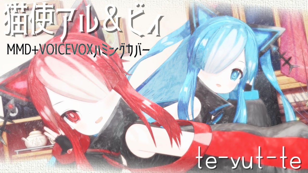 にゃにゃにゃにゃにゃ!(挨拶)<br>というわけで「第一回アルビィ小夜ミコ投稿祭(<a href="https://www.nicovideo.jp/watch/sm45514052" class="watch">sm45514052</a>)」参加作品です!<br><br>VOICEVOXハミングの動画は初めてなので初投稿です!<br>猫使の2人にMMDで歌って踊ってもらう、という目標をようやく達成しました!ワーイ!<br><br>試しに歌ってもらったらいい感じにMIXも出来てかわいかったので動画にしてみました!<br>お裾分けです!よろしければどうぞ!<br><br><br><span style="color: #b7b7b7;">…同じ曲で先日別の動画が上がったばかりなのと<br>字幕が使い回しだったりするのは見逃してください(小声<br><br>同じ曲でも味付けが違えばいくらあってもいいのです。<br>そういうものなのです。<br>いいですね?</span><br><span style="color: #cccccc;">…せっかくの二人用モーションなのでコンビで踊ってもらいたかったのもあります。<br>ということでよろしくお願いいたします!</span><br><br>■楽曲「te-yut-te」 フェイP 様 <a href="https://www.nicovideo.jp/watch/sm14808982" class="watch">sm14808982</a> <a href="https://commons.nicovideo.jp/works/nc39138" target="_blank" rel="noopener">nc39138</a><br> ◆UST Yoru-P 様 <a href="https://www.nicovideo.jp/watch/sm14823230" class="watch">sm14823230</a><br> ◆モーション can 様 <a href="https://www.nicovideo.jp/watch/sm16513441" class="watch">sm16513441</a><br> ◇振付 真雪 様&愛川こずえ 様 <a href="https://www.nicovideo.jp/watch/sm15430187" class="watch">sm15430187</a><br> ◆カメラ 偽毬藻 様 <a href="https://www.nicovideo.jp/watch/sm27273870" class="watch">sm27273870</a><br><br>■歌唱<br> ◆VOICEVOX:猫使アル/猫使ビィ <a href="https://www.nicovideo.jp/watch/sm41977555" class="watch">sm41977555</a><br><br>■3Dモデル<br> ◆VOICEVOX 猫使アル 樹 様 <a href="https://3d.nicovideo.jp/works/td89541" target="_blank" rel="noopener">td89541</a><br> ◆VOICEVOX 猫使ビィ 樹 様 <a href="https://3d.nicovideo.jp/works/td89542" target="_blank" rel="noopener">td89542</a><br><br>その他、コンテンツツリー参照