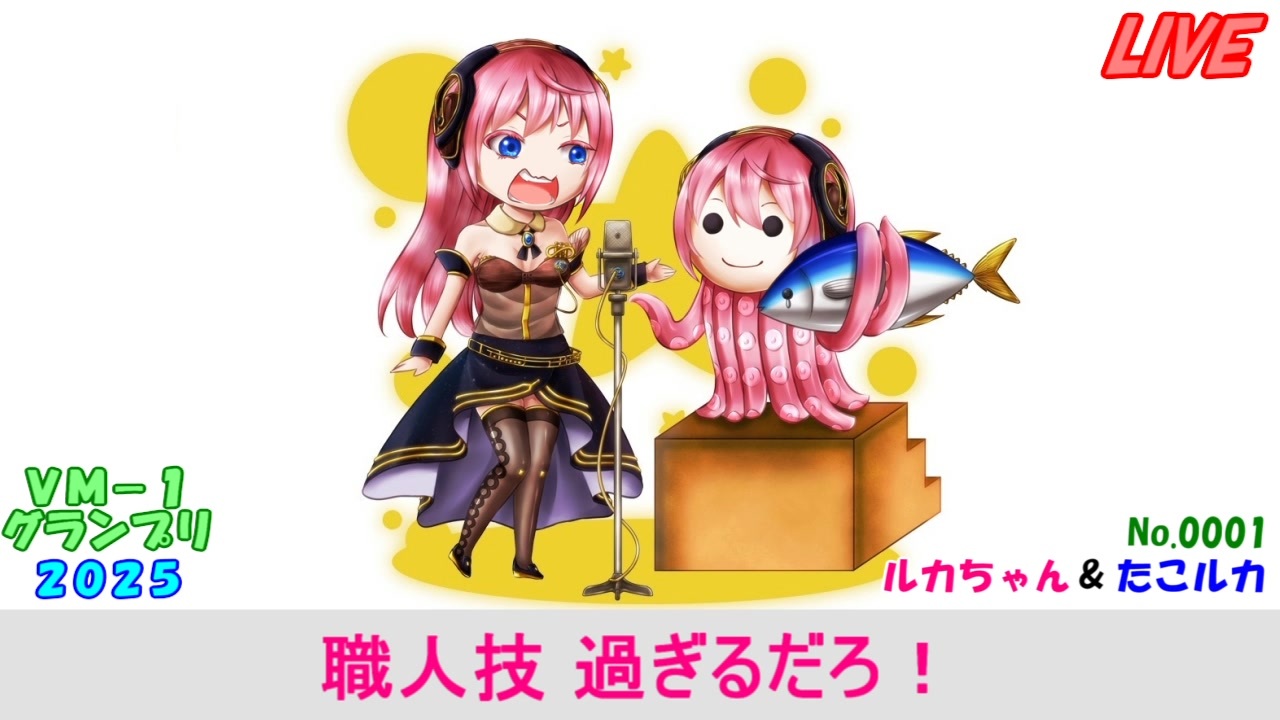 定番といえば定番のネタだと思います。楽しんでいただければ何よりです。<br>ツッコミ担当:ルカちゃん(LUKA V4 SOFT GEN=85、赤字幕、ちょっと低めの声)<br>ボケ担当 :たこルカ (LUKA V4 SOFT GEN=25、青字幕、ちょっと高めの声)<br><br><span style="color: #0000ff;"><strong>VM-1グランプリ2025 参加チームリスト</strong></span> <a href="https://www.nicovideo.jp/mylist/79063861" target="_blank" rel="noopener">mylist/79063861</a><br><span style="color: #0000ff;"><strong>VM-1グランプリ2025のホームページ</strong></span> <a href="http://503sprites.sakura.ne.jp/11000/2500.html" target="_blank" rel="noopener nofollow">http://503sprites.sakura.ne.jp/11000/2500.html</a><br><br>去年のVM-1グランプリ2024ネタ <a href="https://www.nicovideo.jp/watch/sm44445503" class="watch">sm44445503</a> 前作 <a href="https://www.nicovideo.jp/watch/sm45037695" class="watch">sm45037695</a>(大会優勝後の後日談フリートーク)<br>次回作 <a href="https://www.nicovideo.jp/watch/sm45784179" class="watch">sm45784179</a>(VM-1グランプリ2022勝負ネタのノーカットフルバージョン)<br>自作品 <a href="https://www.nicovideo.jp/mylist/12383997" target="_blank" rel="noopener">mylist/12383997</a><br><span style="color: #0000ff;"><strong>ツイッター</strong></span> @batllocenter>