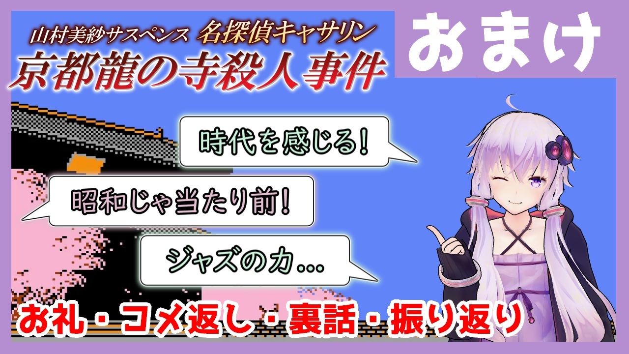 シリーズを完走した感想&コメント返信回です。<br>ご視聴いただいた方々、本当にありがとうございました!<br><br>※当動画にはネタバレが含まれます。ご注意ください。<br><br>リンク<br>------<br>最初 : <a href="https://www.nicovideo.jp/watch/sm45174262" class="watch">sm45174262</a><br><br>シリーズ : <a href="https://www.nicovideo.jp/series/523490" target="_blank" rel="noopener">series/523490</a><br><br>YouTube : <a href="https://www.youtube.com/@YuzukingtonYukari" target="_blank" rel="noopener nofollow">https://www.youtube.com/@YuzukingtonYukari</a><br><br>チャプター<br>----------<br><a href="#" class="seekTime" data-seekTime="00:00" onclick="seekNicoPlayer('#00:00'); return false;">#00:00</a> OP<br><a href="#" class="seekTime" data-seekTime="01:15" onclick="seekNicoPlayer('#01:15'); return false;">#01:15</a> 動画作成の裏話<br><a href="#" class="seekTime" data-seekTime="04:04" onclick="seekNicoPlayer('#04:04'); return false;">#04:04</a> いただけた反応(広告お礼・コメ返し)<br><a href="#" class="seekTime" data-seekTime="22:51" onclick="seekNicoPlayer('#22:51'); return false;">#22:51</a> ED<br><br>ゲーム<br>------<br>山村美紗サスペンス 京都龍の寺殺人事件 - ファミリー・コンピュータ (FC)<br><br>出演者<br>------<br>司会進行<br> CV : VOICEROID:結月ゆかり<br>コメント読み上げ<br> CV : VOICEVOX:ずんだもん<br> CV : VOICEVOX:四国めたん<br><br>ハッシュタグ<br>------------<br>#山村美紗サスペンス #京都龍の寺殺人事件 #ボイロ実況 #結月ゆかり #名探偵キャサリン