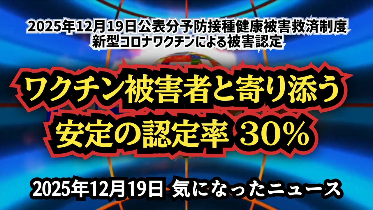 ◆2025年12月19日公表分予防接種健康被害救済制度 新型コロナワクチンによる被害認定 ~ ワクチン被害者と寄り添う安定の認定率30%<br><br>◆今回の台本&詳細<a href="https://keiichiro8140.hatenablog.com/entry/25121999333999" target="_blank" rel="noopener nofollow">https://keiichiro8140.hatenablog.com/entry/25121999333999</a><br><br>◆これまでの動画<a href="https://x.gd/sPXoJ" target="_blank" rel="noopener nofollow">https://x.gd/sPXoJ</a><br><br>◆もしも(BAN)の時のためのマイリンク集<a href="https://lit.link/K-16_News44" target="_blank" rel="noopener nofollow">https://lit.link/K-16_News44</a><br><br>予防接種健康被害救済制度<br>新型コロナワクチン<br>健康被害<br>被害認定<br>死亡認定<br>ワクチン被害<br>認定率30%<br>ワクチン後遺症<br>障害認定の9割が否認定<br>死亡認定1058件<br>安全性に重大な懸念は認められない<br><br>ご覧いただきありがとうございます<br>m(_ _)m<br><br>気になったニュース 2025/12/19<br><br />著作権、肖像権に配慮して作成しております。<br><br>◆気になったニュースの台本!?<br>メモ代わりに作った台本をそのままあげてます<br><a href="https://keiichiro8140.hatenablog.com/." target="_blank" rel="noopener nofollow">https://keiichiro8140.hatenablog.com/.</a><br><br><br>ここからはシリーズ紹介<br><br><br>◆ ワクチン解毒・デトックス<br><a href="https://x.gd/fZweg" target="_blank" rel="noopener nofollow">https://x.gd/fZweg</a><br><br>◆ウイリアム・マキス博士のがん治療(イベルメクチン・フェンベンダゾール等)<br><a href="https://x.gd/AtFYS" target="_blank" rel="noopener nofollow">https://x.gd/AtFYS</a><br><br>◆予防接種健康被害救済制度<br><a href="https://x.gd/0xK9x" target="_blank" rel="noopener nofollow">https://x.gd/0xK9x</a><br><br>◆気になったニュース #1501~<br><br>◆ 【ショートver】気になったニュース<br><a href="https://x.gd/7MxXC" target="_blank" rel="noopener nofollow">https://x.gd/7MxXC</a><br><br>◆ 気になったニュース #1001~<br><a href="https://x.gd/Lp8gv" target="_blank" rel="noopener nofollow">https://x.gd/Lp8gv</a><br><br>◆ 気になったニュース #501~<br><a href="https://x.gd/EmbS4" target="_blank" rel="noopener nofollow">https://x.gd/EmbS4</a><br><br>◆ 気になったニュース #1~#500<br><a href="https://x.gd/uPhNb" target="_blank" rel="noopener nofollow">https://x.gd/uPhNb</a><br><br>◆ X(旧Twitter)・テレグラムで気になった情報<br><a href="https://x.gd/YG6FT" target="_blank" rel="noopener nofollow">https://x.gd/YG6FT</a><br><br>◆ 日比谷5万人パレードデ⚪生放送アーカイブ動画<br><a href="https://x.gd/3CHJv" target="_blank" rel="noopener nofollow">https://x.gd/3CHJv</a><br><br>◆日比谷5万人パレード⚪モのマイリスト作ってみました<br><a href="https://nico.ms/mylist/76828848?ref=sp_other" target="_blank" rel="noopener nofollow">https://nico.ms/mylist/76828848?ref=sp_other</a><br><br>◆3.30 令和の百姓⚪⚪<br><a href="https://www.nicovideo.jp/series/511791?ref=garage_share_other" target="_blank" rel="noopener nofollow">https://www.nicovideo.jp/series/511791?ref=garage_share_other</a><br><br>◆ 及川幸久さんの【XNEWS】シリーズ<br><a href="https://x.gd/3k78K" target="_blank" rel="noopener nofollow">https://x.gd/3k78K</a><br><br>◆これまでの動画<a href="https://x.gd/sPXoJ" target="_blank" rel="noopener nofollow">https://x.gd/sPXoJ</a><br><br>◆もしも(BAN)の時のためのマイリンク集<a href="https://lit.link/K-16_News44" target="_blank" rel="noopener nofollow">https://lit.link/K-16_News44</a><br><br>