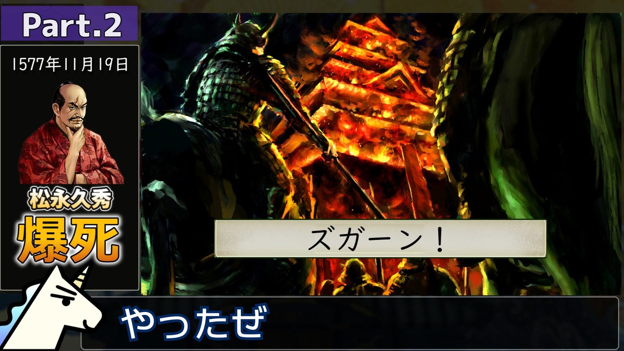 『太閤立志伝5』で【松永久秀爆死】イベントを完遂するまでRTAのpart.2です。<br>最低限まで削ったはずのに解説の時間がえらいことになりました。語ることが多い。多すぎない…?<br><br>内容が良かったと思われましたら、ぜひ【共有】ボタンからSNSで拡散お願いします。<br><br>今年のRTA動画はこれで最後。<br>次の動画は2025年の活動まとめ+反省会の動画です。<br>質問募集の動画を近日中に投稿するのでよければコメントしていってね。<br><br>part.1→<a href="https://www.nicovideo.jp/watch/sm45646247" class="watch">sm45646247</a><br>次作【倫敦精霊探偵団any%】→(30%:2月の初めごろ)進捗はXで(@Nagisa381rta)<br><br>走ったRTAのpart.1まとめ→<a href="https://www.nicovideo.jp/mylist/73222388" target="_blank" rel="noopener">mylist/73222388</a><br>RTA全部まとめ→<a href="https://www.nicovideo.jp/mylist/72786007" target="_blank" rel="noopener">mylist/72786007</a><br><br><u>▽レギュレーション</u><br>タイマー開始:初期設定画面で『決定』を押した瞬間<br>タイマー停止:久秀爆死イベントで『ズガーン!』の字幕が表示された瞬間<br><br><u>▽その他縛りなど</u><br>・イベント【将軍弑逆】を発生させる<br>・バグ技禁止<br>・初期画面でのスキル&能力値、および武将編集機能の使用禁止<br>・追加札の使用は可<br><br>〇Twitter(現:X)→@Nagisa381rta<br>〇Youtube→<a href="https://www.youtube.com/@nagisa381rta" target="_blank" rel="noopener nofollow">https://www.youtube.com/@nagisa381rta</a><br>〇FANBOX→<a href="https://nagisa381.fanbox.cc/" target="_blank" rel="noopener nofollow">https://nagisa381.fanbox.cc/</a><br>〇欲しいものリスト<br>→<a href="https://www.amazon.jp/hz/wishlist/ls/1S72L30BVRILK?ref_=wl_share" target="_blank" rel="noopener nofollow">https://www.amazon.jp/hz/wishlist/ls/1S72L30BVRILK?ref_=wl_share</a><br><br>©コーエーテクモゲームス