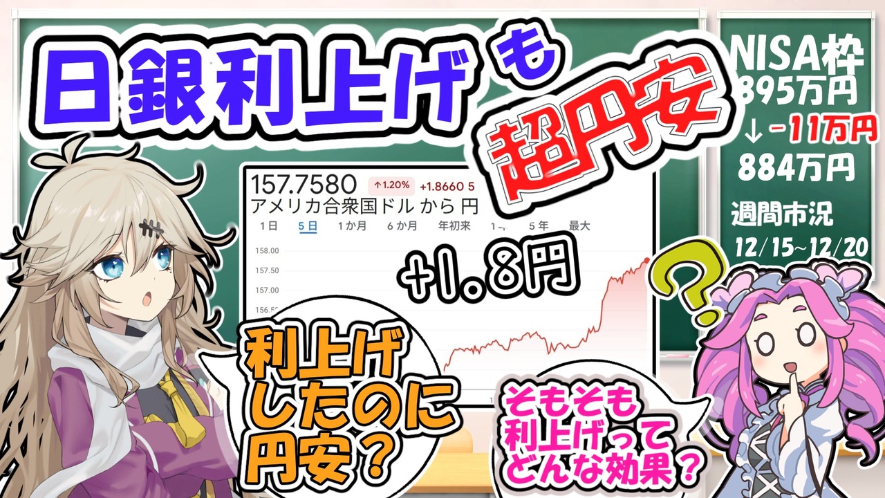 週末に日銀が利上げを決定も為替は円高どころか大きく円安へ<br>07:09 ってかそもそも利上げってどういう理屈で何のためにするの?<br>基礎的なところを解説してみました<br><br>円安要因はこっちから<br>めっちゃ円安!通貨の価値ってどう決まる?<br><a href="https://youtu.be/V73xRHFkXPM" target="_blank" rel="noopener nofollow">https://youtu.be/V73xRHFkXPM</a><br><br>今週は先週のブロードコムの決算好調も見通し悪化や<br>オラクルのデータセンタ建設の遅延や<br>資金調達元のブルーアウルから出資を見送られるなどの動向から<br>かねてよりのAI関連の懸念が再度悪化しハイテク市場中心に下落も<br>CPIが発表され予測値を超える定価であったことから<br>インフレの懸念が減退し利上げ観測が上昇<br>また直近、家庭向けから撤退しメモリの高騰から話題になっていた<br>マイクロンテクノロジーが決算にて先行き見通し好調で大幅高になり<br>ブロードコムやオラクルなどの要因で後退していたAI懸念が後退<br>市場は週末に向け回復方向に動きました<br><br>そんないろいろあった一週間を<br>今週もずんだもんたちに<br>簡単説明してもらいます<br>動画内容に変なところがあればコメントで指摘していただけると助かります。<br><br>また年初に360万を主要投信の<br>オルカン・S&P500・NASDAQ100・FANG+など<br>主要投信に一括投資していた場合の推移や<br>投稿者のNISA枠の推移なども公表しています<br><br>チャンネル登録はこちらから<br><a href="https://www.youtube.com/channel/UCKkqz2ih4gkvFqZL6EEPsIw" target="_blank" rel="noopener nofollow">https://www.youtube.com/channel/UCKkqz2ih4gkvFqZL6EEPsIw</a><br><br><br>素材のお借り先<br><br>いらすとや様 <a href="https://www.irasutoya.com/" target="_blank" rel="noopener nofollow">https://www.irasutoya.com/</a><br>ニコニ・コモンズ様 <a href="https://commons.nicovideo.jp/" target="_blank" rel="noopener nofollow">https://commons.nicovideo.jp/</a><br><br>立ち絵等<br>坂本アヒル様 <a href="https://seiga.nicovideo.jp/user/illust/97452727" target="_blank" rel="noopener nofollow">https://seiga.nicovideo.jp/user/illust/97452727</a><br><br>サムネ等<br><br>ヤッペン様 <a href="https://seiga.nicovideo.jp/seiga/im11442803" target="_blank" rel="noopener nofollow">https://seiga.nicovideo.jp/seiga/im11442803</a><br><br>VOICEVOX<br>ずんだもん<br>春日部つむぎ<br>中国うさぎ<br><a href="https://voicevox.hiroshiba.jp/" target="_blank" rel="noopener nofollow">https://voicevox.hiroshiba.jp/</a><br><br>#ずんだもん<br>#VOICEVOX<br>#NISA<br>#投資<br>#経済<br>#市況<br>#S&P500<br>#日経平均<br>#利上げ<br>#円安<br>