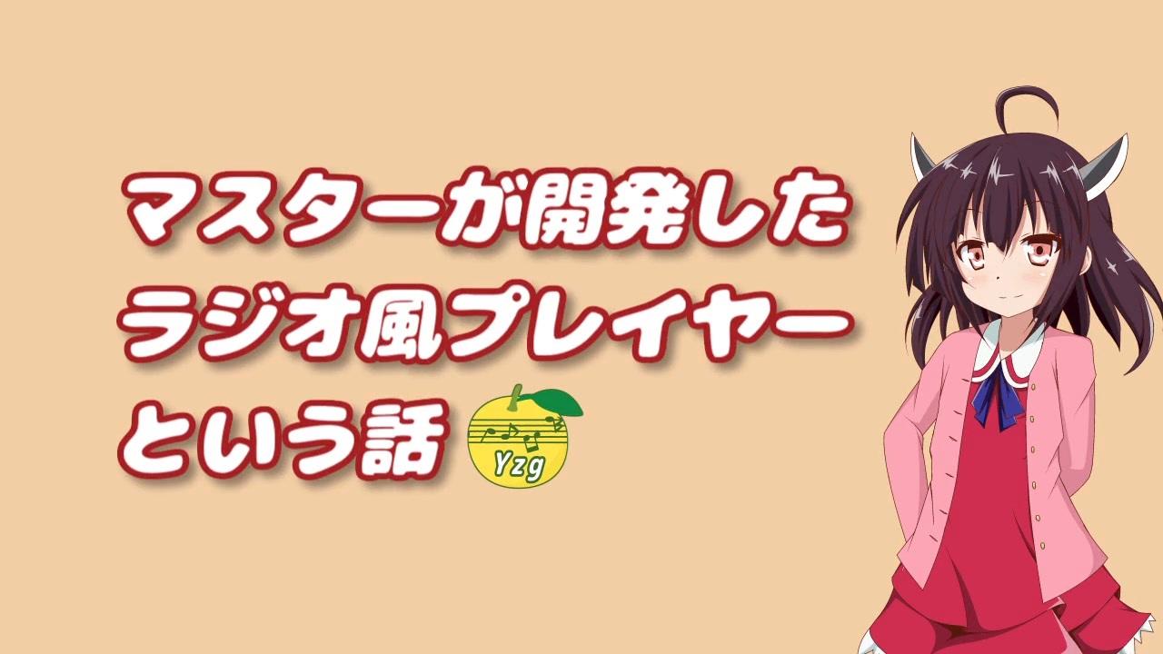 ゆずごしょうです。<br><br>ろくに動画も制作しないで、<br>「ラジオ風プレイヤー」というソフトを開発したので、<br>ご紹介いたします。<br><br>◇お借りした作品<br>・東北きりたん立ち絵:夜刀 様 / <a href="https://seiga.nicovideo.jp/seiga/im10273157" target="_blank" rel="noopener">im10273157</a><br>・シーンチェンジ:hikarururu 様 / <a href="https://commons.nicovideo.jp/works/nc361381" target="_blank" rel="noopener">nc361381</a><br> EMIT 様 / <a href="https://commons.nicovideo.jp/works/nc414391" target="_blank" rel="noopener">nc414391</a><br>・効果音:たつろー・Tスタ 様 / <a href="https://commons.nicovideo.jp/works/nc391982" target="_blank" rel="noopener">nc391982</a><br><br>語り:東北きりたん(VOICEPEAK)<br><br>他に歌っていただいた曲集 <a href="https://www.nicovideo.jp/mylist/74426245" target="_blank" rel="noopener">mylist/74426245</a> <a href="https://www.nicovideo.jp/mylist/77779798" target="_blank" rel="noopener">mylist/77779798</a> <br><br>◇2025/12/21 追記 <br>多くのコメントありがとうございます。<br>予想以上に要望を頂き、驚いています。<br>例外処理をしっかりコーティングしたのち配布しようかと検討中です。<br>なおワンコーラス判定は、終了時間を各曲ごとに人力で設定しています。<br>画面左下付近にある「EndingTime」の値がそれです。<br><br>多くのご要望にお応えして、配布を開始します。<br><a href="https://github.com/Yuzugosho92/RadioPlayer/releases" target="_blank" rel="noopener nofollow">https://github.com/Yuzugosho92/RadioPlayer/releases</a> <br><br>◇2025/12/25 追記<br>MITライセンスで公開しています。ご自由にお使いください。<br><a href="https://github.com/Yuzugosho92/RadioPlayer" target="_blank" rel="noopener nofollow">https://github.com/Yuzugosho92/RadioPlayer</a>