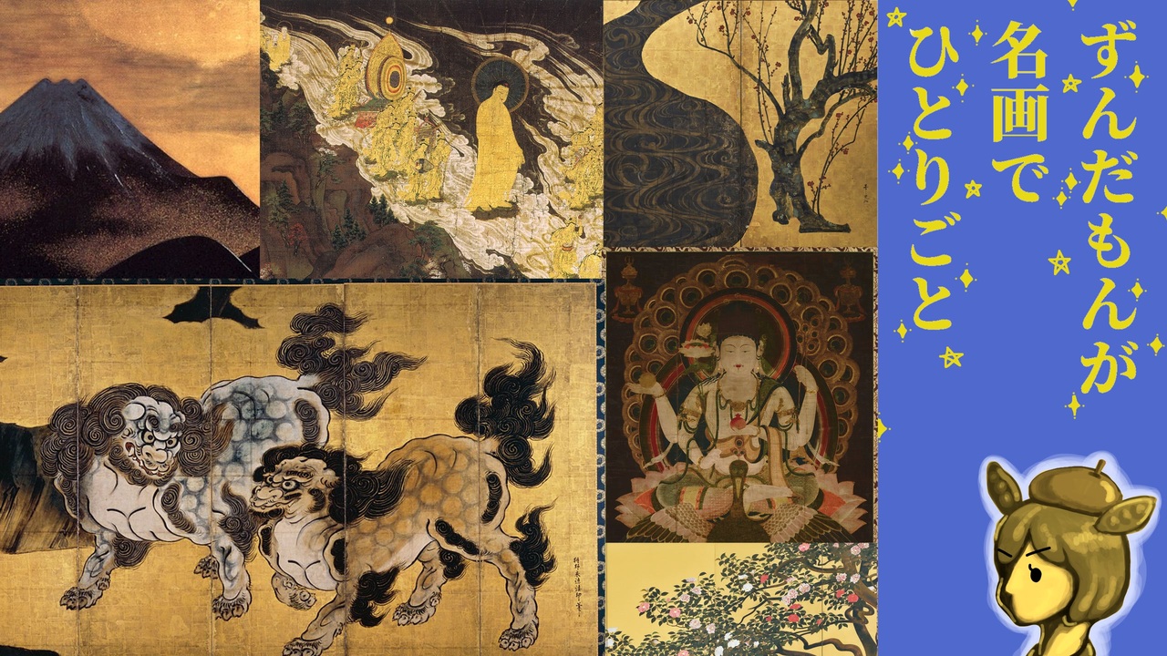 金歴祭(<a href="https://www.nicovideo.jp/watch/sm45519346" class="watch">sm45519346</a>)参加作品。<br>平安から昭和にかけての日本の金ピカ絵画を紹介。<br>今回はゴージャス仕様。国宝4件、重要文化財1件を含む計6枚の絵をセレクト!<br>金ピカ絵画を通して時代性が見えてくる(?)。<br><br>作品(画像はいずれもwikipediaコモンズから)<br>・「孔雀明王像」国宝<br>・「阿弥陀二十五菩薩来迎図(早来迎)」国宝<br>・狩野永徳「唐獅子図屏風」国宝<br>・尾形光琳「紅白梅図屏風」国宝<br>・柴田是真「富士田子浦蒔絵額」<br>・速水御舟「名樹散椿」重要文化財<br><br>参考図書<br>『美術出版ライブラリー歴史編 日本美術史』監修 山下裕二・髙岸輝、美術出版社、2014年<br>『日本の美Ⅲ 日本の四季 春│夏』監修 高階秀爾、美術年鑑社、2008年<br>『開館50周年記念 山種美術館 近代日本画名品選100』監修 山下裕二、山種美術館、2016年<br>参考WEBページ(閲覧はいずれも2025年12月21日)<br>京都国立博物館HP「阿弥陀二十五菩薩来迎図(早来迎)」<br><a href="https://www.kyohaku.go.jp/jp/collection/meihin/butsuga/item06/" target="_blank" rel="noopener nofollow">https://www.kyohaku.go.jp/jp/collection/meihin/butsuga/item06/</a> <br>皇居三の丸尚蔵館HP「唐獅子図屏風」<br><a href="https://shozokan.nich.go.jp/collection/object/SZK002944" target="_blank" rel="noopener nofollow">https://shozokan.nich.go.jp/collection/object/SZK002944</a><br>MOA美術館HP「紅白梅図屏風」<br><a href="https://www.moaart.or.jp/collections/053/" target="_blank" rel="noopener nofollow">https://www.moaart.or.jp/collections/053/</a><br><br><br>語り WEB版voicevoxずんだもん<br>BGM <a href="https://commons.nicovideo.jp/works/nc348193" target="_blank" rel="noopener">nc348193</a><br>「【NASH公式】The Golden Ring - NSS-5004-07」by Nash Music Library<br>ウェブサイト:<a href="https://www.nash.jp/nml/" target="_blank" rel="noopener nofollow">https://www.nash.jp/nml/</a><br>音楽配信サービス:<a href="https://www.tunecore.co.jp/artists/nashmusiclibrary" target="_blank" rel="noopener nofollow">https://www.tunecore.co.jp/artists/nashmusiclibrary</a><br>
