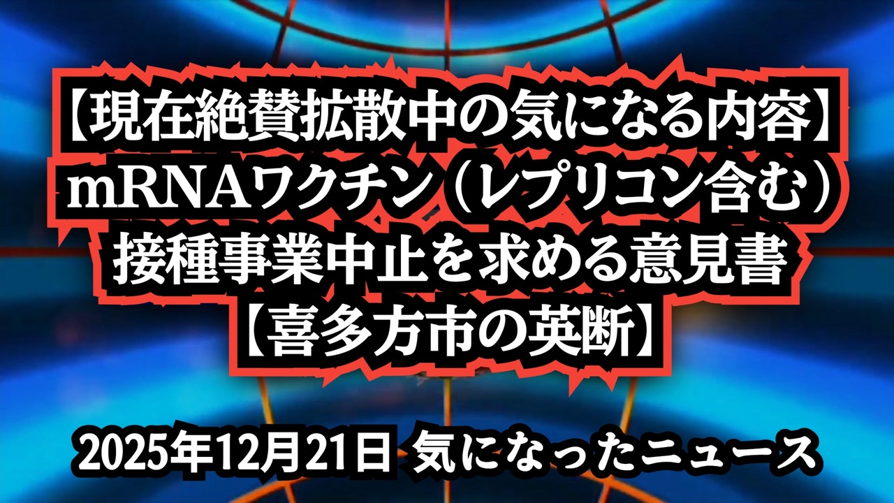 【日本中に拡散中の気になる中身】◆mRNAワクチン (レプリコンワクチンを含む) 接種事業中止を求める意見書【喜多方市の英断】<br><br>あらすじ<br>国の方針に、地方議会が正式に異議を唱えた。<br>福島県・喜多方市議会が提出したのは、mRNAワクチン(レプリコン含む)の接種事業中止を求める「意見書」。そこには感情論ではなく、市民による情報開示請求データ、国の救済制度の認定状況、そして厚労省自身の通知文書が根拠として明記されていた。<br>なぜ市議会は「中止」という最も強い言葉を選んだのか。<br>接種後データの分析から見える“ある傾向”、被害認定の限界、ワクチンの作用機序への疑問、そして国の安全評価の現状とは――。<br><br>◆今回の台本&詳細<a href="https://keiichiro8140.hatenablog.com/entry/25122111222" target="_blank" rel="noopener nofollow">https://keiichiro8140.hatenablog.com/entry/25122111222</a><br><br>◆福島県喜多方市議会が「mRNAワクチン接種 事業の中止」を求める意見書を可決!<a href="https://nico.ms/sm45745457?ref=other_cap_off" target="_blank" rel="noopener nofollow">https://nico.ms/sm45745457?ref=other_cap_off</a><br><br>◆およそ3300万回接種分のコロナワクチン接種後死亡データ ~ ロット別死亡率 ~ ゆうこく連合+mRNAワクチン中止を求める国民連合<br><a href="https://nico.ms/sm45522507?ref=other_cap_off" target="_blank" rel="noopener nofollow">https://nico.ms/sm45522507?ref=other_cap_off</a><br><br>◆2025年12月19日公表分予防接種健康被害救済制度 新型コロナワクチンによる被害認定 ~ ワクチン被害者と寄り添う安定の認定率30%<br><a href="https://nico.ms/sm45744273?ref=other_cap_off" target="_blank" rel="noopener nofollow">https://nico.ms/sm45744273?ref=other_cap_off</a><br><br>◆これまでの動画<a href="https://x.gd/sPXoJ" target="_blank" rel="noopener nofollow">https://x.gd/sPXoJ</a><br><br>◆もしも(BAN)の時のためのマイリンク集<a href="https://lit.link/K-16_News44" target="_blank" rel="noopener nofollow">https://lit.link/K-16_News44</a><br><br>喜多方市<br>新型コロナワクチン<br>レプリコンワクチン<br>mRNAワクチン<br>予防接種健康被害救済制度<br>健康被害<br>mRNAワクチン接種事業の中止<br>福島県<br>自己増殖型ワクチン<br>ワクチン副反応<br>ワクチンの安全性<br><br>ご覧いただきありがとうございます<br>m(_ _)m<br><br>気になったニュース 2025/12/21<br><br />著作権、肖像権に配慮して作成しております。<br><br>◆気になったニュースの台本!?<br>メモ代わりに作った台本をそのままあげてます<br><a href="https://keiichiro8140.hatenablog.com/." target="_blank" rel="noopener nofollow">https://keiichiro8140.hatenablog.com/.</a><br><br><br>ここからはシリーズ紹介<br><br><br>◆ ワクチン解毒・デトックス<br><a href="https://x.gd/fZweg" target="_blank" rel="noopener nofollow">https://x.gd/fZweg</a><br><br>◆ウイリアム・マキス博士のがん治療(イベルメクチン・フェンベンダゾール等)<br><a href="https://x.gd/AtFYS" target="_blank" rel="noopener nofollow">https://x.gd/AtFYS</a><br><br>◆予防接種健康被害救済制度<br><a href="https://x.gd/0xK9x" target="_blank" rel="noopener nofollow">https://x.gd/0xK9x</a><br><br>◆気になったニュース #1501~<br><br>◆ 【ショートver】気になったニュース<br><a href="https://x.gd/7MxXC" target="_blank" rel="noopener nofollow">https://x.gd/7MxXC</a><br><br>◆ 気になったニュース #1001~<br><a href="https://x.gd/Lp8gv" target="_blank" rel="noopener nofollow">https://x.gd/Lp8gv</a><br><br>◆ 気になったニュース #501~<br><a href="https://x.gd/EmbS4" target="_blank" rel="noopener nofollow">https://x.gd/EmbS4</a><br><br>◆ 気になったニュース #1~#500<br><a href="https://x.gd/uPhNb" target="_blank" rel="noopener nofollow">https://x.gd/uPhNb</a><br><br>◆ X(旧Twitter)・テレグラムで気になった情報<br><a href="https://x.gd/YG6FT" target="_blank" rel="noopener nofollow">https://x.gd/YG6FT</a><br><br>◆ 日比谷5万人パレードデ⚪生放送アーカイブ動画<br><a href="https://x.gd/3CHJv" target="_blank" rel="noopener nofollow">https://x.gd/3CHJv</a><br><br>◆日比谷5万人パレード⚪モのマイリスト作ってみました<br><a href="https://nico.ms/mylist/76828848?ref=sp_other" target="_blank" rel="noopener nofollow">https://nico.ms/mylist/76828848?ref=sp_other</a><br><br>◆3.30 令和の百姓⚪⚪<br><a href="https://www.nicovideo.jp/series/511791?ref=garage_share_other" target="_blank" rel="noopener nofollow">https://www.nicovideo.jp/series/511791?ref=garage_share_other</a><br><br>◆ 及川幸久さんの【XNEWS】シリーズ<br><a href="https://x.gd/3k78K" target="_blank" rel="noopener nofollow">https://x.gd/3k78K</a><br><br>◆これまでの動画<a href="https://x.gd/sPXoJ" target="_blank" rel="noopener nofollow">https://x.gd/sPXoJ</a><br><br>◆もしも(BAN)の時のためのマイリンク集<a href="https://lit.link/K-16_News44" target="_blank" rel="noopener nofollow">https://lit.link/K-16_News44</a><br><br>