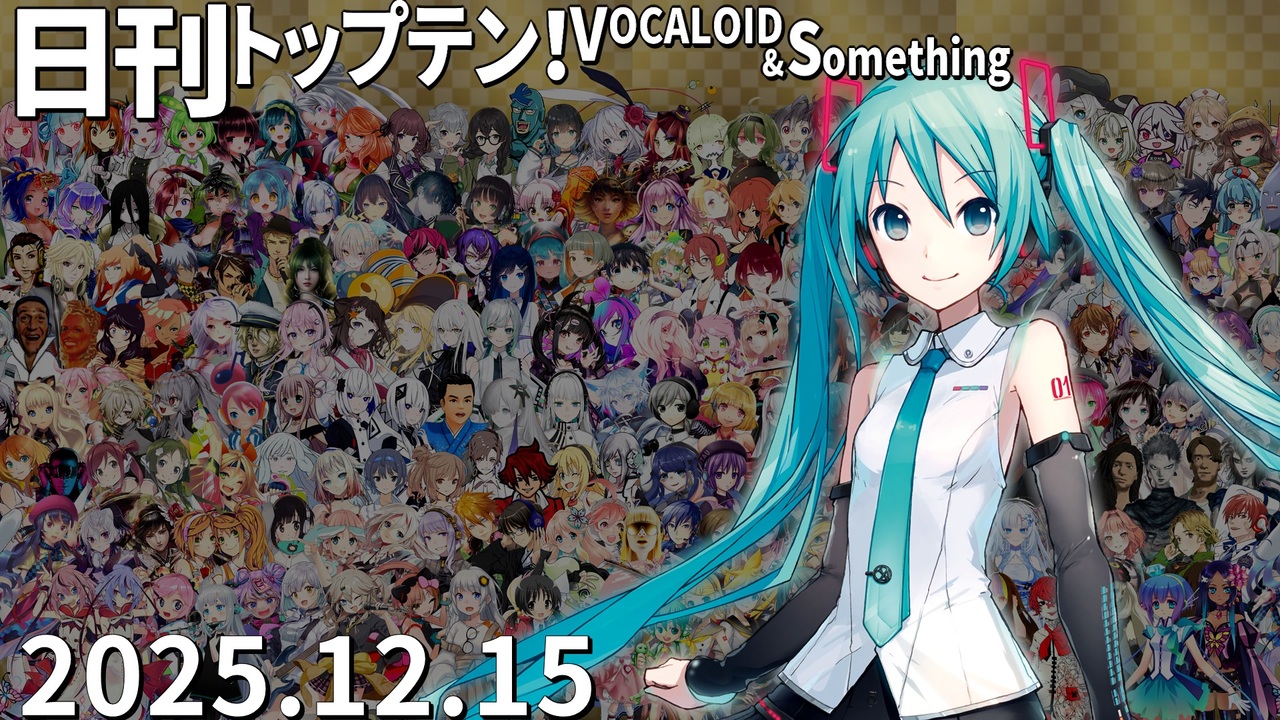 前日(12/14)←<a href="https://www.nicovideo.jp/watch/sm45741096" class="watch">sm45741096</a> <a href="https://www.nicovideo.jp/watch/sm45759028" class="watch">sm45759028</a>→翌日(12/16)<br>★ボカコレアプリ字幕機能に対応!<br>Android <a href="https://play.google.com/store/apps/details?id=jp.nicovideo.nicobox&hl=ja" target="_blank" rel="noopener nofollow">https://play.google.com/store/apps/details?id=jp.nicovideo.nicobox&hl=ja</a><br>iOS <a href="https://apps.apple.com/jp/app/id421753493" target="_blank" rel="noopener nofollow">https://apps.apple.com/jp/app/id421753493</a><br>★チャプター<br>昨日1位<a href="#" class="seekTime" data-seekTime="0:00" onclick="seekNicoPlayer('#0:00'); return false;">#0:00</a> TOP10<a href="#" class="seekTime" data-seekTime="0:36" onclick="seekNicoPlayer('#0:36'); return false;">#0:36</a> 1年前<a href="#" class="seekTime" data-seekTime="2:56" onclick="seekNicoPlayer('#2:56'); return false;">#2:56</a> TOP3<a href="#" class="seekTime" data-seekTime="3:24" onclick="seekNicoPlayer('#3:24'); return false;">#3:24</a> 10年前<a href="#" class="seekTime" data-seekTime="5:01" onclick="seekNicoPlayer('#5:01'); return false;">#5:01</a> PICKUP<a href="#" class="seekTime" data-seekTime="5:29" onclick="seekNicoPlayer('#5:29'); return false;">#5:29</a> <br><br>★トップテン<br>10:<a href="https://www.nicovideo.jp/watch/sm45716660" class="watch">sm45716660</a> 9:<a href="https://www.nicovideo.jp/watch/sm45714947" class="watch">sm45714947</a> 8:<a href="https://www.nicovideo.jp/watch/sm45713962" class="watch">sm45713962</a> 7:<a href="https://www.nicovideo.jp/watch/sm45709382" class="watch">sm45709382</a> <br>6:<a href="https://www.nicovideo.jp/watch/sm45719080" class="watch">sm45719080</a> 5:<a href="https://www.nicovideo.jp/watch/sm45712095" class="watch">sm45712095</a> 4:<a href="https://www.nicovideo.jp/watch/sm45718394" class="watch">sm45718394</a> 3:<a href="https://www.nicovideo.jp/watch/sm45720087" class="watch">sm45720087</a> 2:<a href="https://www.nicovideo.jp/watch/sm45722496" class="watch">sm45722496</a> 1:<a href="https://www.nicovideo.jp/watch/sm45722281" class="watch">sm45722281</a> <br><br>★ピックアップ(B~Fは超新着枠)<br>B:<a href="https://www.nicovideo.jp/watch/sm45727092" class="watch">sm45727092</a> C:<a href="https://www.nicovideo.jp/watch/sm45719991" class="watch">sm45719991</a> D:<a href="https://www.nicovideo.jp/watch/sm45727303" class="watch">sm45727303</a> E:<a href="https://www.nicovideo.jp/watch/sm45719818" class="watch">sm45719818</a> F:<a href="https://www.nicovideo.jp/watch/sm45726595" class="watch">sm45726595</a> G:<a href="https://www.nicovideo.jp/watch/sm45713271" class="watch">sm45713271</a> <br>H:<a href="https://www.nicovideo.jp/watch/sm45692921" class="watch">sm45692921</a> I:<a href="https://www.nicovideo.jp/watch/sm45704201" class="watch">sm45704201</a> <br><br>★プレイバック <br>A(1年前):<a href="https://www.nicovideo.jp/watch/sm44428160" class="watch">sm44428160</a> 十(10年前):<a href="https://www.nicovideo.jp/watch/sm27790524" class="watch">sm27790524</a> 前日の第1位: <a href="https://www.nicovideo.jp/watch/sm45720215" class="watch">sm45720215</a>(初音ミク)<br><br>☆集計対象:2025/12/8~15 5時投稿の作品(12/15 5時集計)<br>★計算式:再生×1+コメント×最大12+いいね!×18+マイリスト×17<br>☆プレイリスト:<u><a href="https://nikkantop10.hatenablog.com/entry/ar20251215" target="_blank" rel="noopener nofollow">https://nikkantop10.hatenablog.com/entry/ar20251215</a></u> 、 <a href="https://www.nicovideo.jp/mylist/49271984" target="_blank" rel="noopener">mylist/49271984</a> <br>★1年前トップテン:<a href="https://www.nicovideo.jp/watch/sm44435685" class="watch">sm44435685</a><br />★日刊トップテン動画一覧マイリスト:<a href="https://www.nicovideo.jp/mylist/47849908" target="_blank" rel="noopener">mylist/47849908</a><br>☆ルールや計算式の詳細:<a href="https://nikkantop10-sub.hatenablog.com/entry/top10_rule" target="_blank" rel="noopener nofollow">https://nikkantop10-sub.hatenablog.com/entry/top10_rule</a><br><span style="color: #262626;">★K!!te Playlist LINK!:<a href="https://kiite.jp/user/AIST_playlist_bot" target="_blank" rel="noopener nofollow">https://kiite.jp/user/AIST_playlist_bot</a><br>☆Twitter:<a href="https://twitter.com/VOCALO_NEWRANK" target="_blank" rel="noopener nofollow">https://twitter.com/VOCALO_NEWRANK</a><br>★Thread:<a href="https://www.threads.net/@lukanan_p" target="_blank" rel="noopener nofollow">https://www.threads.net/@lukanan_p</a></span><br><br><span style="color: #0000ff;"><strong>◆今後の動画投稿イベント情報</strong></span><br>2025/12/29~31 <strong>先端映像音楽表現投稿祭</strong> <a href="https://twipla.jp/events/678401" target="_blank" rel="noopener nofollow">https://twipla.jp/events/678401</a><br>2026/1/1~4 <strong>ボカロサビ投稿祭2026 </strong><a href="https://twipla.jp/events/705936" target="_blank" rel="noopener nofollow">https://twipla.jp/events/705936</a> ※既存曲は新規投稿で参加可<br>2026/1/10~12 <strong>ポストロック投稿祭 </strong><a href="https://twipla.jp/events/694939" target="_blank" rel="noopener nofollow">https://twipla.jp/events/694939</a>