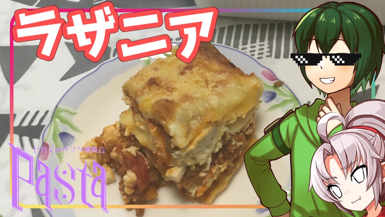<span style="color: #ff0000; font-size: 24px;"><strong>祝!セカイのパスタ博覧会開催!!</strong></span><br>…今回はまにあった<br><br>パスタは麺状だけじゃない?<br>これもパスタの一種類!<br>ということでラザーニャで参戦です!<br><br>いいねコメントは、お昼休み明けのついなちゃんの様子を書いておきました。<br><br>主催:サンセット 様(告知動画: <a href="https://www.nicovideo.jp/watch/sm45373922" class="watch">sm45373922</a>)<br><br><a href="https://www.nicovideo.jp/watch/sm45728433" class="watch">sm45728433</a> ⇐前| <a href="https://www.nicovideo.jp/mylist/72995657" target="_blank" rel="noopener">mylist/72995657</a> | 次⇒ <a href="https://www.nicovideo.jp/watch/sm45787527" class="watch">sm45787527</a><br><br>※本動画に使用している立ち絵について<br>うぃあの椅子 様(<a href="https://seiga.nicovideo.jp/seiga/im9749895" target="_blank" rel="noopener">im9749895</a>)の「ついなちゃん立ち絵 v1.4」について、利用規約の範囲内で「衣装・表情差分の一部を投稿者が加筆」「付属パーツを背景用に一部加工」したものになります。<br>