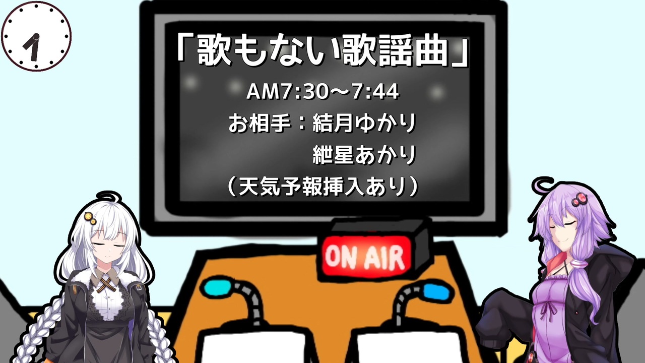 今年も「歌もない歌謡曲」が放送されます。<br>今回は、ゆづきずの二人が担当します。<br>途中で挿入されている天気予報は、12月21日17時発表のものです。<br><br><a href="#" class="seekTime" data-seekTime="00:00" onclick="seekNicoPlayer('#00:00'); return false;">#00:00</a> CM ボイボ銀行CI ナレ:冥鳴ひまり<br><a href="#" class="seekTime" data-seekTime="01:00" onclick="seekNicoPlayer('#01:00'); return false;">#01:00</a> 「歌もない歌謡曲」OP MC:結月ゆかり、紲星あかり<br><a href="#" class="seekTime" data-seekTime="01:10" onclick="seekNicoPlayer('#01:10'); return false;">#01:10</a> 1曲目「アテンション・プリーズ!」 作:騒音のない世界様 <a href="https://www.nicovideo.jp/watch/sm45684297" class="watch">sm45684297</a><br> <a href="#" class="seekTime" data-seekTime="01:30" onclick="seekNicoPlayer('#01:30'); return false;">#01:30</a> トーク1 今年の動画振り返り<br><a href="#" class="seekTime" data-seekTime="02:45" onclick="seekNicoPlayer('#02:45'); return false;">#02:45</a> 2曲目「もくもく湯けむり」 作:騒音のない世界様 <a href="https://www.nicovideo.jp/watch/sm38664753" class="watch">sm38664753</a><br> <a href="#" class="seekTime" data-seekTime="02:55" onclick="seekNicoPlayer('#02:55'); return false;">#02:55</a> 曲をBGMに県内の模様 ナレ:桜乃そら<br><a href="#" class="seekTime" data-seekTime="05:15" onclick="seekNicoPlayer('#05:15'); return false;">#05:15</a> 3曲目「いつもの帰り道」 作:騒音のない世界様 <a href="https://www.nicovideo.jp/watch/sm41644761" class="watch">sm41644761</a><br> <a href="#" class="seekTime" data-seekTime="05:18" onclick="seekNicoPlayer('#05:18'); return false;">#05:18</a> トーク2 コメント返し<br><a href="#" class="seekTime" data-seekTime="09:24" onclick="seekNicoPlayer('#09:24'); return false;">#09:24</a> 4曲目「東海道をいく」 作:騒音のない世界様 <a href="https://www.nicovideo.jp/watch/sm36177963" class="watch">sm36177963</a><br> <a href="#" class="seekTime" data-seekTime="10:51" onclick="seekNicoPlayer('#10:51'); return false;">#10:51</a> トーク3 コミケ107参加します<br> <a href="#" class="seekTime" data-seekTime="11:26" onclick="seekNicoPlayer('#11:26'); return false;">#11:26</a> トーク4 来年の予定 <br><a href="#" class="seekTime" data-seekTime="12:09" onclick="seekNicoPlayer('#12:09'); return false;">#12:09</a> 「歌もない歌謡曲」ED<br><a href="#" class="seekTime" data-seekTime="13:00" onclick="seekNicoPlayer('#13:00'); return false;">#13:00</a> CM ボイボ銀行 ナレ:栗田まろん<br><a href="#" class="seekTime" data-seekTime="13:20" onclick="seekNicoPlayer('#13:20'); return false;">#13:20</a> CM ゆづきず商事 ナレ:春日部つむぎ<br><a href="#" class="seekTime" data-seekTime="13:40" onclick="seekNicoPlayer('#13:40'); return false;">#13:40</a> CM ボイボ土地建物 ナレ:白上虎太郎、もち子さん<br> <br>台本交換会の動画<br>台本提供:秋冬色彩様(<a href="https://www.nicovideo.jp/user/123691432" target="_blank" rel="noopener">user/123691432</a>)<br>マスターの台本は、ぉとうふ様(<a href="https://www.nicovideo.jp/user/132192080" target="_blank" rel="noopener">user/132192080</a>)へ渡り、<br>「急募:英語のできるボーカル」(<a href="https://www.nicovideo.jp/watch/sm45351885" class="watch">sm45351885</a>)になりました。<br><br><ニコニコモンズ><br> 親作品リストを参照してください。<br><br><ニコニコモンズ以外><br>【フォント】<br> フォント名:「やさしさゴシックボールドV2」 制作者:フロップフォントデザイン<br> フリーダウンロード:<a href="https://flopdesign.booth.pm/items/1833993" target="_blank" rel="noopener nofollow">https://flopdesign.booth.pm/items/1833993</a><br><br>【ナレーション】<br> A.I.VOICE:結月ゆかり、紲星あかり 運営元:エーアイ<br> VOICEROID2:桜乃そら 運営元:株式会社AHS<br> VOICEVOX:冥鳴ひまり、栗田まろん、春日部つむぎ、白上虎太郎、もち子さん(cv明日葉よもぎ)<br><br>【編集】<br> 静画:FireAlpaca<br> 動画:Cyberlink PowerDirector 365<br><br>【天気予報】<br> 気象庁 福島地方気象台 21日17時発表の予報<br> <a href="https://www.jma.go.jp" target="_blank" rel="noopener nofollow">https://www.jma.go.jp</a><br>