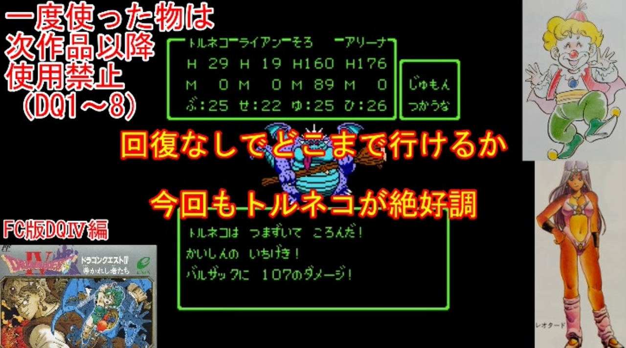 DQⅣの1周目、FCDQⅣ編part8です。<br>FC版パノンの強さを実戦を交えて紹介するつもりでしたが、思った以上にスムーズ進行。<br>Ⅲの3周全てで苦労した分、Ⅳはサクサクすぎて感覚が狂いますね。<br><br>前→<a href="https://www.nicovideo.jp/watch/sm45686636" class="watch">sm45686636</a><br>次→<a href="https://www.nicovideo.jp/watch/sm45752625" class="watch">sm45752625</a><br><br>YouTube版→<a href="https://youtu.be/wJAVxHe0hZs" target="_blank" rel="noopener nofollow">https://youtu.be/wJAVxHe0hZs</a><br><br>縛りルール(詳細はpart1参照)<br>①一度使った武器・防具・装飾品・道具・呪文・特技は<br> 次作品以降使用禁止。(売却も解禁扱い)<br><br> 一度使った職業(3,6,7)・仲間モンスター(5,6)・スカウトモンスター(8)は<br> 戦士(Ⅲ)、戦士(Ⅵ)のようにナンバリングで分類し次作品以降使用禁止。<br> また複数体加入できる仲間モンスターは一体まで。<br><br>②裏技、バグ技、全滅、逃走、おどかす禁止。<br> またダンジョン攻略とボス戦における状況再現禁止。<br><br>③ダンジョンとボス攻略は、全キャラのレベルを突入時、<br> 1周目は目標レベル+5。2周目は+10。3周目は+15まで。<br> ラスボスの目標レベルは45。裏ボスは50とする。<br>(目標レベルは各公式ガイドブックを参照)<br><br>④1周目はEDまで。2周目は裏ボス撃破まで。<br> 3周目は全てのボスを規定回数、規定ターン以内に倒す。<br>(回避可能なボスも倒し、闇ゾーマは3周全てで倒す)<br><br><br><span style="color: #262626;">※一部機種は互換機を使用してのプレイとなりますが、倍速機能やクイックセーブ・ロード、チートなどは一切使用しません。</span><br><br>※ネタバレ注意です<br><br>この動画で利用している株式会社スクウェア・エニックスを代表とする共同著作者が権利を所有する著作物及びスギヤマ工房有限会社が権利を所有する楽曲の転載・配布は禁止いたします。<br>(C) ARMOR PROJECT/BIRD STUDIO/SQUARE ENIX All Rights Reserved.<br>(C) SUGIYAMA KOBO (P) SUGIYAMA KOBO<br><br>AquesTalk2ライセンスID:AQTK2WINUSR23122185<br /><br><br>❤いいねを押していただけるとモチベーションと投稿速度が上がるので宜しくお願い致します!<br><br>作者ツイッター→ <a href="https://twitter.com/nig0117" target="_blank" rel="noopener nofollow">https://twitter.com/nig0117</a><br>PIXIV FANBOX→ <a href="https://sutanokeiji.fanbox.cc/" target="_blank" rel="noopener nofollow">https://sutanokeiji.fanbox.cc/</a><br><br>( 以前はWEB小説書いてました→ <a href="https://kakuyomu.jp/works/1177354054884910267" target="_blank" rel="noopener nofollow">https://kakuyomu.jp/works/1177354054884910267</a> )