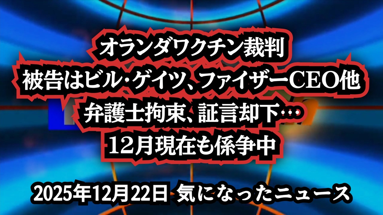 ◆この裁判、証言が却下されています…オランダで裁判進行中!被告はビル・ゲイツ、ファイザーCEO他多数 ~ オランダで始まった異例の裁判<br><br>あらすじ<br>オランダの裁判所で、新型コロナ政策とワクチン導入をめぐる重大な訴訟が現在も係争中だ。この裁判では、弁護士ピーター・スタッセンが原告側代理を務め、ビル・ゲイツ、ファイザーCEOアルバート・ブーラ、オランダ前首相マーク・ルッテらを被告として、国際法上の責任が問われている。<br>この訴訟には当初2人の弁護士が関わっていたが、そのうちアルノ・ファン・ケッセル弁護士が2025年に拘束され、現在はスタッセン弁護士が訴訟を担当している。<br>注目すべき点は、キャサリン・オースティン・フィッツ、サーシャ・ラティポワ、マイケル・イェードン博士、キャサリン・ワット、ジョセフ・サンソーン医師といった専門家証言が、地裁段階で却下されたことであり、この判断を不服として原告側は控訴に踏み切った。<br>裁判は2025年12月現在も継続中だが、主要メディアではほとんど報じられていない。<br><br>◆今回の台本&詳細<a href="https://keiichiro8140.hatenablog.com/entry/2512222111" target="_blank" rel="noopener nofollow">https://keiichiro8140.hatenablog.com/entry/2512222111</a><br><br>◆これまでの動画<a href="https://x.gd/sPXoJ" target="_blank" rel="noopener nofollow">https://x.gd/sPXoJ</a><br><br>◆もしも(BAN)の時のためのマイリンク集<a href="https://lit.link/K-16_News44" target="_blank" rel="noopener nofollow">https://lit.link/K-16_News44</a><br><br>オランダ裁判<br>人道に対する罪<br>ワクチン訴訟<br>専門家証言却下<br>キャサリン・オースティン・フィッツ<br>ピーター・スタッセン<br>ビル・ゲイツ<br>ファイザー<br>担当弁護士逮捕拘束<br>アルノ・ファン・ケッセル<br>メディア報道無し<br><br>ご覧いただきありがとうございます<br>m(_ _)m<br><br>気になったニュース 2025/12/22<br><br />著作権、肖像権に配慮して作成しております。<br><br>◆気になったニュースの台本!?<br>メモ代わりに作った台本をそのままあげてます<br><a href="https://keiichiro8140.hatenablog.com/." target="_blank" rel="noopener nofollow">https://keiichiro8140.hatenablog.com/.</a><br><br><br>ここからはシリーズ紹介<br><br><br>◆ ワクチン解毒・デトックス<br><a href="https://x.gd/fZweg" target="_blank" rel="noopener nofollow">https://x.gd/fZweg</a><br><br>◆ウイリアム・マキス博士のがん治療(イベルメクチン・フェンベンダゾール等)<br><a href="https://x.gd/AtFYS" target="_blank" rel="noopener nofollow">https://x.gd/AtFYS</a><br><br>◆予防接種健康被害救済制度<br><a href="https://x.gd/0xK9x" target="_blank" rel="noopener nofollow">https://x.gd/0xK9x</a><br><br>◆気になったニュース #1501~<br><br>◆ 【ショートver】気になったニュース<br><a href="https://x.gd/7MxXC" target="_blank" rel="noopener nofollow">https://x.gd/7MxXC</a><br><br>◆ 気になったニュース #1001~<br><a href="https://x.gd/Lp8gv" target="_blank" rel="noopener nofollow">https://x.gd/Lp8gv</a><br><br>◆ 気になったニュース #501~<br><a href="https://x.gd/EmbS4" target="_blank" rel="noopener nofollow">https://x.gd/EmbS4</a><br><br>◆ 気になったニュース #1~#500<br><a href="https://x.gd/uPhNb" target="_blank" rel="noopener nofollow">https://x.gd/uPhNb</a><br><br>◆ X(旧Twitter)・テレグラムで気になった情報<br><a href="https://x.gd/YG6FT" target="_blank" rel="noopener nofollow">https://x.gd/YG6FT</a><br><br>◆ 日比谷5万人パレードデ⚪生放送アーカイブ動画<br><a href="https://x.gd/3CHJv" target="_blank" rel="noopener nofollow">https://x.gd/3CHJv</a><br><br>◆日比谷5万人パレード⚪モのマイリスト作ってみました<br><a href="https://nico.ms/mylist/76828848?ref=sp_other" target="_blank" rel="noopener nofollow">https://nico.ms/mylist/76828848?ref=sp_other</a><br><br>◆3.30 令和の百姓⚪⚪<br><a href="https://www.nicovideo.jp/series/511791?ref=garage_share_other" target="_blank" rel="noopener nofollow">https://www.nicovideo.jp/series/511791?ref=garage_share_other</a><br><br>◆ 及川幸久さんの【XNEWS】シリーズ<br><a href="https://x.gd/3k78K" target="_blank" rel="noopener nofollow">https://x.gd/3k78K</a><br><br>◆これまでの動画<a href="https://x.gd/sPXoJ" target="_blank" rel="noopener nofollow">https://x.gd/sPXoJ</a><br><br>◆もしも(BAN)の時のためのマイリンク集<a href="https://lit.link/K-16_News44" target="_blank" rel="noopener nofollow">https://lit.link/K-16_News44</a><br><br>