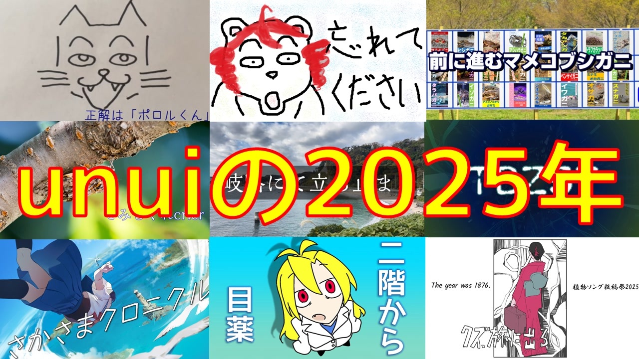 unuiと申します<br>2025年も様々な方に支えられて活動をすることができました<br>この場を借りてお礼申し上げます<br><br>軈てさん主催のXFD投稿祭2025に参加します<br><a href="https://twipla.jp/events/701221" target="_blank" rel="noopener nofollow">https://twipla.jp/events/701221</a><br>1曲12秒で今年公開できた11曲を紹介させていただきますのでよろしくお願いいたします<br><br><紹介作リンク><br>カゲボウシ:<a href="https://www.nicovideo.jp/watch/sm44495385" class="watch">sm44495385</a><br>シロクマeffect:<a href="https://www.nicovideo.jp/watch/sm44650729" class="watch">sm44650729</a><br>TBZ57:<a href="https://www.nicovideo.jp/watch/sm44722259" class="watch">sm44722259</a><br>クズ、旅に出る:<a href="https://www.nicovideo.jp/watch/sm44891494" class="watch">sm44891494</a><br>僕はエノキタケ:<a href="https://www.nicovideo.jp/watch/sm45190858" class="watch">sm45190858</a><br>せみしぐれcrier:<a href="https://www.nicovideo.jp/watch/sm45260341" class="watch">sm45260341</a><br>二階から目薬:<a href="https://www.nicovideo.jp/watch/sm45218234" class="watch">sm45218234</a><br>さかさまクロニクル:<a href="https://www.nicovideo.jp/watch/sm45346660" class="watch">sm45346660</a><br>前に進むマメコブシガニ:<a href="https://www.nicovideo.jp/watch/sm45391165" class="watch">sm45391165</a><br>岐路にて立ち止まる(有色版):<a href="https://www.nicovideo.jp/watch/sm45703524" class="watch">sm45703524</a><br>ふえるわかめみたいな愛のうた:<a href="https://www.nicovideo.jp/watch/so45516128" class="watch">so45516128</a>