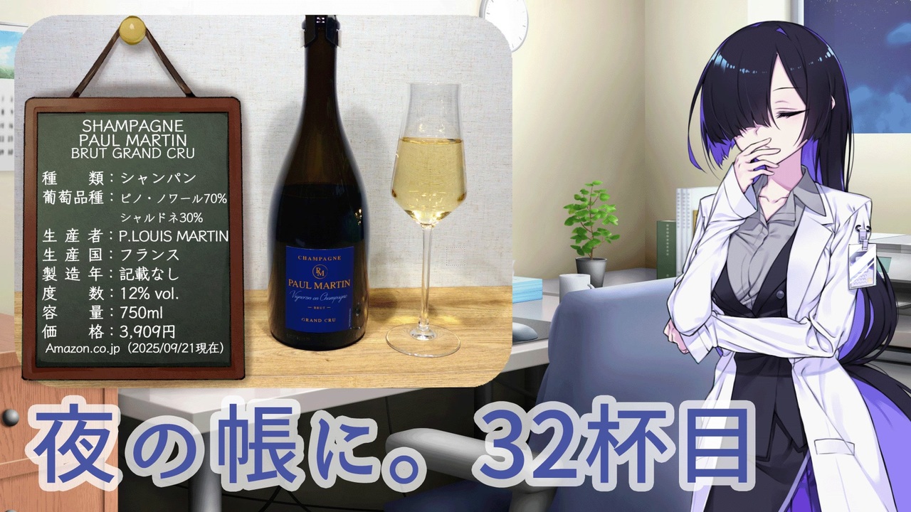 クリスマスに間に合う・・・かな?<br><br>日本では、お酒はハタチになってから!<br>お酒は飲みたい人が楽しんで飲みましょう。<br><br>Hima_Wine氏のブログ:<br>ヒマだしワインのむ。|ワインブログ<br>Amazonで売ってる激安シャンパーニュ! ポール・マルタンについて調べてみた<br><a href="https://himawine.hatenablog.com/entry/paulmartin" target="_blank" rel="noopener nofollow">https://himawine.hatenablog.com/entry/paulmartin</a><br><br>CAST<br> 夜語トバリ(A.I.VOICE Junior)<br><br>立ち絵<br> 聡間まこと 様<br><br>背景<br> みんちり 様<br> <a href="https://min-chi.material.jp/" target="_blank" rel="noopener nofollow">https://min-chi.material.jp/</a><br> Pb 様<br><br>台詞背景<br> 浅井麻 様<br> <a href="https://asavo.fanbox.cc/posts/2066454" target="_blank" rel="noopener nofollow">https://asavo.fanbox.cc/posts/2066454</a><br><br>いいねボタン<br> nakatomi 様<br><br>BGM<br> むつき醒 様(PeriTune)<br> <a href="https://peritune.com/" target="_blank" rel="noopener nofollow">https://peritune.com/</a><br> ♪Cryptic_Canvas<br><br>SE<br> 効果音ラボ 様<br> <a href="https://soundeffect-lab.info/" target="_blank" rel="noopener nofollow">https://soundeffect-lab.info/</a><br><br>お世話になったツール<br> AviUtl・拡張編集Plugin<br> Aviutl プラグイン 「かんたんMP4出力」<br> <a href="https://aoytsk.blog.jp/aviutl/34586383.html" target="_blank" rel="noopener nofollow">https://aoytsk.blog.jp/aviutl/34586383.html</a><br> PSDToolkit・かんしくん<br> かんしくん設定ファイル作成ツール<br> <a href="https://oov.github.io/forcepser/" target="_blank" rel="noopener nofollow">https://oov.github.io/forcepser/</a><br> AVIUTL 自動呼吸アニメーション<br> L-SMASH・L-SMASH Works<br> <a href="http://l-smash.github.io/l-smash/" target="_blank" rel="noopener nofollow">http://l-smash.github.io/l-smash/</a><br> <a href="https://pop.4-bit.jp/?page_id=7929" target="_blank" rel="noopener nofollow">https://pop.4-bit.jp/?page_id=7929</a><br> ContentsTree プラグイン<br> SplitWindow<br> 相対パス保存プラグイン<br> 縁取りスクリプト<br><br>使用フリーフォント<br> ほのか新アンティーク角<br> <a href="https://font.gloomy.jp/" target="_blank" rel="noopener nofollow">https://font.gloomy.jp/</a><br> チョーク体<br> <a href="http://font.cutegirl.jp/" target="_blank" rel="noopener nofollow">http://font.cutegirl.jp/</a><br> IPAex明朝<br> <a href="https://moji.or.jp/ipafont/" target="_blank" rel="noopener nofollow">https://moji.or.jp/ipafont/</a>