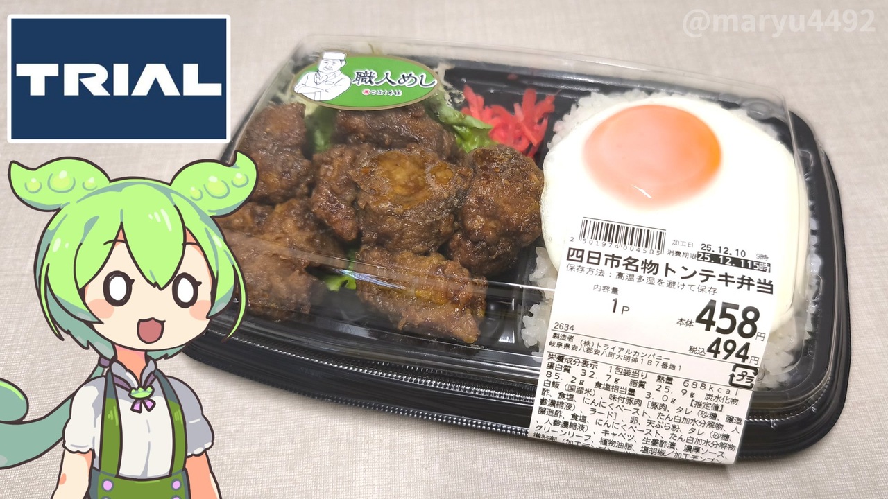 トライアルに行ったら、三重県四日市市の名物とかいた<br>トンテキ弁当があったので買ってみることにしました。<br><br><br><br>【参考】<br>トライアルホールディングス<br><a href="https://trial-holdings.inc/" target="_blank" rel="noopener nofollow">https://trial-holdings.inc/</a><br>三重・四日市名物とんてきのお店8選|とんてきの定義も紹介(観光三重)<br><a href="https://www.kankomie.or.jp/report/860" target="_blank" rel="noopener nofollow">https://www.kankomie.or.jp/report/860</a><br>四日市とんてき協会<br><a href="https://tonteki.com/" target="_blank" rel="noopener nofollow">https://tonteki.com/</a><br>四日市公害と環境未来館<br><a href="https://www.city.yokkaichi.mie.jp/yokkaichikougai-kankyoumiraikan/" target="_blank" rel="noopener nofollow">https://www.city.yokkaichi.mie.jp/yokkaichikougai-kankyoumiraikan/</a><br>こにゅうどうくんのプロフィール(こにゅうどうくんのお部屋)<br><a href="https://konyudokun.net/about/" target="_blank" rel="noopener nofollow">https://konyudokun.net/about/</a><br><br>【使用した素材】(※敬称略) <br>(合成音声)VOICEVOX/ずんだもん/四国めたん<br><a href="https://voicevox.hiroshiba.jp/" target="_blank" rel="noopener nofollow">https://voicevox.hiroshiba.jp/</a> <br>(立ち絵)坂本アヒル<br> <a href="https://seiga.nicovideo.jp/seiga/im10788496" target="_blank" rel="noopener nofollow">https://seiga.nicovideo.jp/seiga/im10788496</a><br>(楽曲)甘茶の音楽工房/「楽しい麦畑」「フルーツパフェ」「お城の舞踏会」<br><a href="https://amachamusic.chagasi.com/" target="_blank" rel="noopener nofollow">https://amachamusic.chagasi.com/</a>