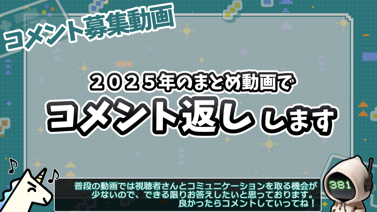 今年も1年のまとめ動画を作成します。<br>動画内でコメント返しのコーナーを設けますので、質問、ご意見、ご感想など募集しております。<br>たくさん返したいのでぜひコメントしていってね!<br><br>まとめ動画→<a href="https://www.nicovideo.jp/watch/sm45799891" class="watch">sm45799891</a>(1/3 24:00公開)<br><br>マシュマロはコチラ→<a href="https://marshmallow-qa.com/euxgxp4q9m236fx?t=OkF38s&utm_medium=url_text&utm_source=promotion" target="_blank" rel="noopener nofollow">https://marshmallow-qa.com/euxgxp4q9m236fx?t=OkF38s&utm_medium=url_text&utm_source=promotion</a><br><br>去年(2024)のまとめ動画→<a href="https://www.nicovideo.jp/watch/sm44480903" class="watch">sm44480903</a><br>一昨年(2023)のまとめ動画→<a href="https://www.nicovideo.jp/watch/sm43188200" class="watch">sm43188200</a><br><br><br>