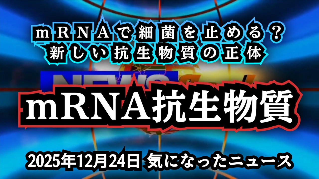 ◆mRNA抗生物質『細菌の遺伝子を止める新しい薬』が静かに始まっている<br><br>mRNAで細菌を止める?新しい抗生物質の正体<br><br>あらすじ<br>これまで抗生物質といえば、細菌を直接殺す薬だった。<br>しかし今、新しい仕組みの抗生物質が研究されている。それが『mRNA抗生物質』だ。<br>この技術は、mRNAワクチンと似た仕組みを使い、細菌の中に短いRNAを送り込み、生命維持に必要な遺伝子の働きを止めるというものだ。<br>細菌を壊すのではなく、『設計されたRNAで機能を止める』という全く新しい発想である。<br>この方法は特定の細菌だけを狙えるとされ、薬剤耐性対策として期待されている一方、遺伝子レベルに直接介入する点に不安の声もある。<br>まだ研究段階だが、私たちの医療の常識を変える可能性を秘めたこの技術。<br><br>◆今回の台本&詳細<a href="https://keiichiro8140.hatenablog.com/entry/25122444111" target="_blank" rel="noopener nofollow">https://keiichiro8140.hatenablog.com/entry/25122444111</a><br><br>◆これまでの動画<a href="https://x.gd/sPXoJ" target="_blank" rel="noopener nofollow">https://x.gd/sPXoJ</a><br><br>◆もしも(BAN)の時のためのマイリンク集<a href="https://lit.link/K-16_News44" target="_blank" rel="noopener nofollow">https://lit.link/K-16_News44</a><br><br>mRNA抗生物質<br>新しい抗生物質<br>遺伝子を止める薬<br>細菌を止める仕組み<br>医療ニュース解説<br>最新医療技術<br>mRNA技術<br>抗生物質の未来<br>医療の新常識<br>知らないと怖い医療<br>今話題の医療ニュース<br><br>ご覧いただきありがとうございます<br>m(_ _)m<br><br>気になったニュース 2025/12/24<br><br />著作権、肖像権に配慮して作成しております。<br><br>◆気になったニュースの台本!?<br>メモ代わりに作った台本をそのままあげてます<br><a href="https://keiichiro8140.hatenablog.com/." target="_blank" rel="noopener nofollow">https://keiichiro8140.hatenablog.com/.</a><br><br><br>ここからはシリーズ紹介<br><br><br>◆ ワクチン解毒・デトックス<br><a href="https://x.gd/fZweg" target="_blank" rel="noopener nofollow">https://x.gd/fZweg</a><br><br>◆ウイリアム・マキス博士のがん治療(イベルメクチン・フェンベンダゾール等)<br><a href="https://x.gd/AtFYS" target="_blank" rel="noopener nofollow">https://x.gd/AtFYS</a><br><br>◆予防接種健康被害救済制度<br><a href="https://x.gd/0xK9x" target="_blank" rel="noopener nofollow">https://x.gd/0xK9x</a><br><br>◆気になったニュース #1501~<br><br>◆ 【ショートver】気になったニュース<br><a href="https://x.gd/7MxXC" target="_blank" rel="noopener nofollow">https://x.gd/7MxXC</a><br><br>◆ 気になったニュース #1001~<br><a href="https://x.gd/Lp8gv" target="_blank" rel="noopener nofollow">https://x.gd/Lp8gv</a><br><br>◆ 気になったニュース #501~<br><a href="https://x.gd/EmbS4" target="_blank" rel="noopener nofollow">https://x.gd/EmbS4</a><br><br>◆ 気になったニュース #1~#500<br><a href="https://x.gd/uPhNb" target="_blank" rel="noopener nofollow">https://x.gd/uPhNb</a><br><br>◆ X(旧Twitter)・テレグラムで気になった情報<br><a href="https://x.gd/YG6FT" target="_blank" rel="noopener nofollow">https://x.gd/YG6FT</a><br><br>◆ 日比谷5万人パレードデ⚪生放送アーカイブ動画<br><a href="https://x.gd/3CHJv" target="_blank" rel="noopener nofollow">https://x.gd/3CHJv</a><br><br>◆日比谷5万人パレード⚪モのマイリスト作ってみました<br><a href="https://nico.ms/mylist/76828848?ref=sp_other" target="_blank" rel="noopener nofollow">https://nico.ms/mylist/76828848?ref=sp_other</a><br><br>◆3.30 令和の百姓⚪⚪<br><a href="https://www.nicovideo.jp/series/511791?ref=garage_share_other" target="_blank" rel="noopener nofollow">https://www.nicovideo.jp/series/511791?ref=garage_share_other</a><br><br>◆ 及川幸久さんの【XNEWS】シリーズ<br><a href="https://x.gd/3k78K" target="_blank" rel="noopener nofollow">https://x.gd/3k78K</a><br><br>◆これまでの動画<a href="https://x.gd/sPXoJ" target="_blank" rel="noopener nofollow">https://x.gd/sPXoJ</a><br><br>◆もしも(BAN)の時のためのマイリンク集<a href="https://lit.link/K-16_News44" target="_blank" rel="noopener nofollow">https://lit.link/K-16_News44</a><br><br>