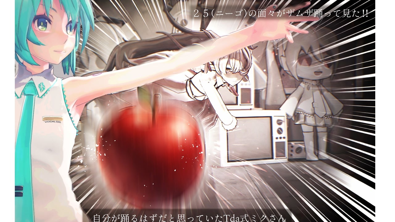 <br>林檎を投げるようにザムザさん、ITTANBAIさんゆうりんさん、ミーネンロイマーさん、xf108さんOkiさんGreen.gさん広告ありがとうございます!<br>ニーゴの面々がザムザを踊ってみた!<br><br>じつは1年くらい前に出来てたのですが、ある事情からうぷしてなかった動画になります。<br>最大の理由は、まふゆのスカートがあらぶり過ぎて・・・動画つくりはじめたときは普通だったんですが途中から、すごく変になり始めて・・・修正はしたんですが・・・<br>動画も上書き保存してたのでもとの環境にも戻れず、スマヌ・・・<br><br>あと、ニーゴのメンバーで奏だけでてないのですが・・・別に嫌いじゃなくて、ただロシアのハッカー事件の影響でキャラが入手できない感じに?・・;;奏さんもスマヌ・・<br><br>途中でしょんぼりっくな瑞希がでてきて???な方もいると思うのですが去年の12月の瑞希とえななんのイベントを反映させようとおもってここだけ変えさせてもらいました。イベント見てない方はよくわからないかもしれないです・・・<br><br>最後に冒頭で理不尽にもリンゴをぶつけられるtda式ミクさん・・・これは完全に作者のせいです。<br>ごめんなさい!!(平身低頭)<br><br>原曲<br>ザムザ / てにをは feat.初音ミク<br><a href="https://www.nicovideo.jp/watch/sm42047041" class="watch">sm42047041</a><br><br>MMDモーション<br>【MMDモーション配布】ザムザ【モーションキャプチャー】 MobiusP<br><a href="https://www.nicovideo.jp/watch/sm43034568" class="watch">sm43034568</a><br><br>振付元ダンス<br>ひかる(@hikaru_8310)様<br><br>MMD カメラ<br>ひなさん 【MMD】ザムザ - Camera DL youtube<br><br><br>MMD モデル<br><br>Tda式Wシニヨン初音ミク(suwaviola)<br><br>誰もいないセカイ」の初音ミク(Moskva)<br><br>朝比奈まふゆver1.0(つなまよ)<br><br>うたうた式暁山瑞希(Utauta)<br><br>東雲絵名ver2.0(じろー)<br><br>MMD ステージ<br>MMD ステージ てれびステージ(まきろん)<br><br>MME<br><br>autoluminous,excellentshadow2,motion buller,(そぼろ)<br>空中に漂うホコリ(化身バレッタ)<br>o-self overlay,o-like HDR(otamonn) postrimlighting(ミーフォ茜)<br><br>以上のものをお借りいたしました!本当に感謝です・・・<br><br>