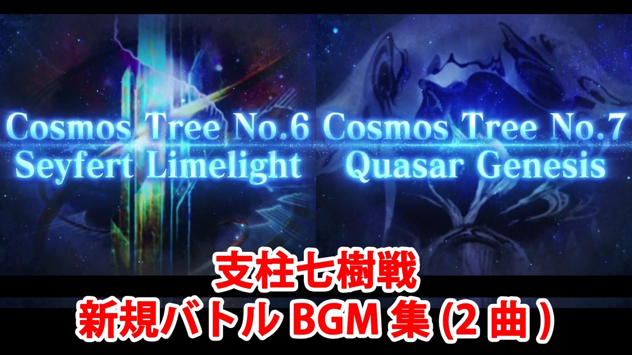 「第2部終章」の支柱七樹戦での新規バトルBGMのまとめです。<br><br><a href="#" class="seekTime" data-seekTime="00:00" onclick="seekNicoPlayer('#00:00'); return false;">#00:00</a> 空想樹セイファート・ライムライト戦(第6異聞帯)<br><a href="#" class="seekTime" data-seekTime="03:42" onclick="seekNicoPlayer('#03:42'); return false;">#03:42</a> 空想樹クエーサー・ジェネシス戦(第7異聞帯)<br><br>第1~第5異聞帯担当の空想樹戦は既存BGMです。<br>(第1と第2がTREE BATTLE 1、第3がTREE BATTLE 2、第4がTREE BATTLE 2.5、第5がTREE BATTLE 3です)<br><br>YouTube版はこちら<br><a href="https://www.youtube.com/watch?v=9cptllvh4lU" target="_blank" rel="noopener nofollow">https://www.youtube.com/watch?v=9cptllvh4lU</a>